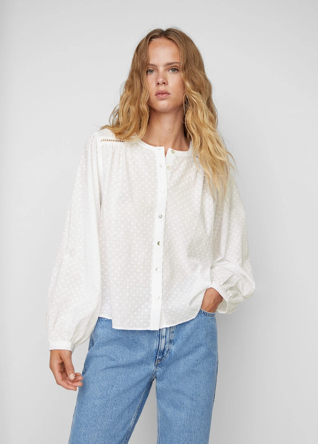 tissu 100 % coton, tissu plumetis, tissu fluide, coupe droite, col rond, manches longues bouffantes, poignets boutonnes, fermeture boutonnee sur le devant, style boho, style romantiqueComposition: 100% coton. Dentelle: 100% coton