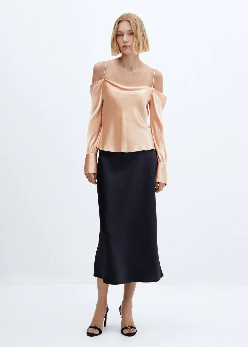 tissu satine, tissu fluide, droit, col drape, manches longues boutonnees, bretelles fines, sans fermeture, collection fetes et ceremoniesComposition: 100% viscose. Lisiere: 100% viscose
