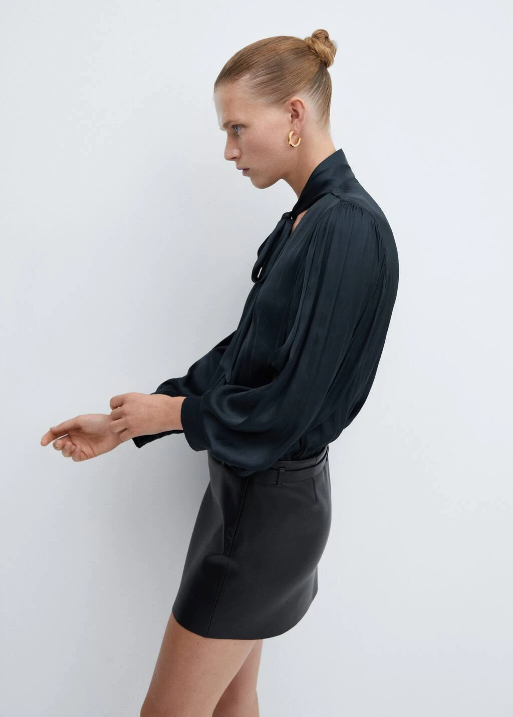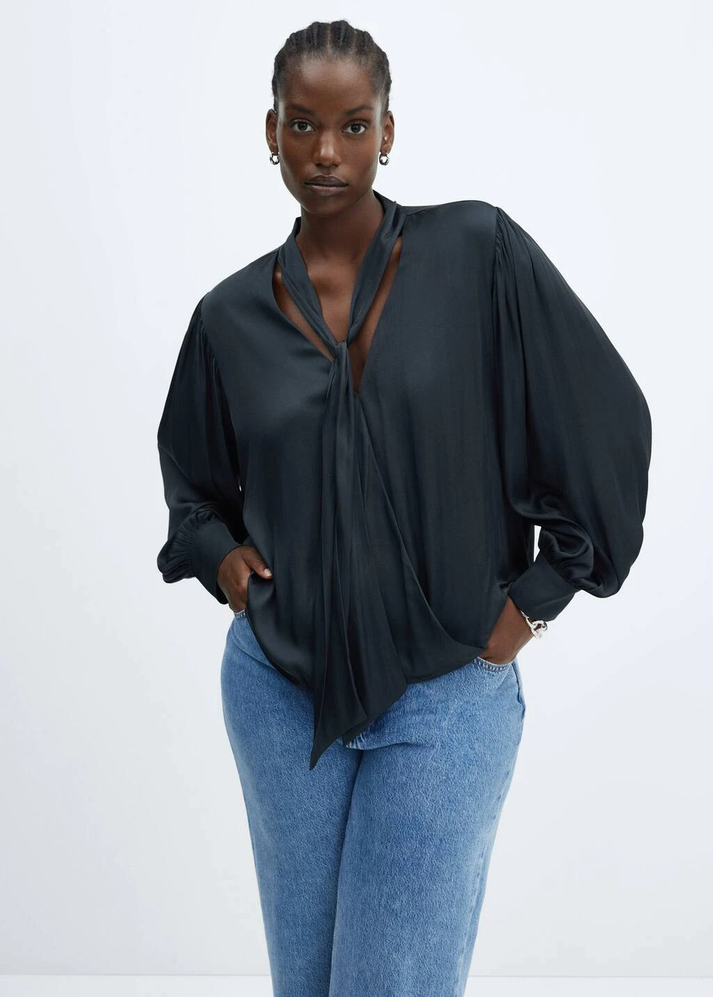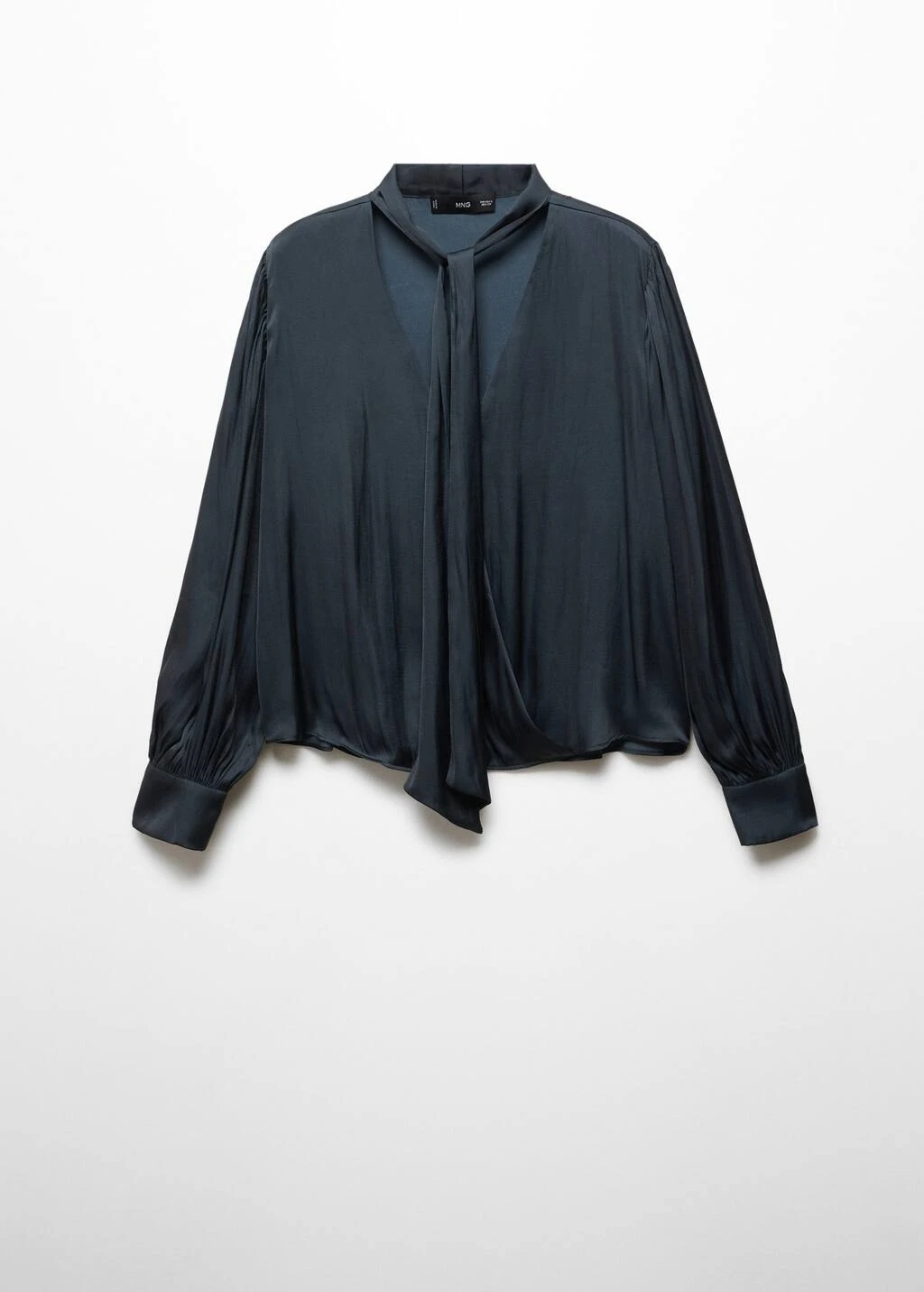 tissu satine, coupe droite, col en v, nœud au col, manches longues bouffantes, disponible plusComposition: 100% polyester