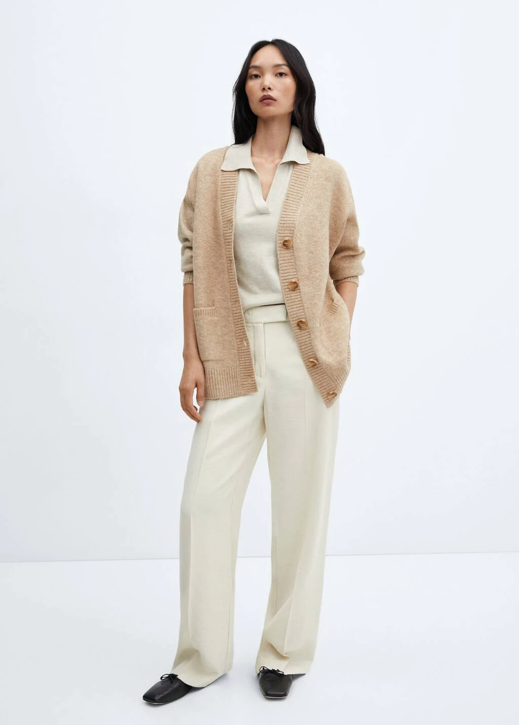 tissu en grosse maille, tissu de laine melange, droit, coupe longue, col en v, manches longues, deux poches plaquees sur le devant, fermeture boutonnee sur le devantComposition: 50% acrylique,44% polyester,5% laine,1% elasthanne