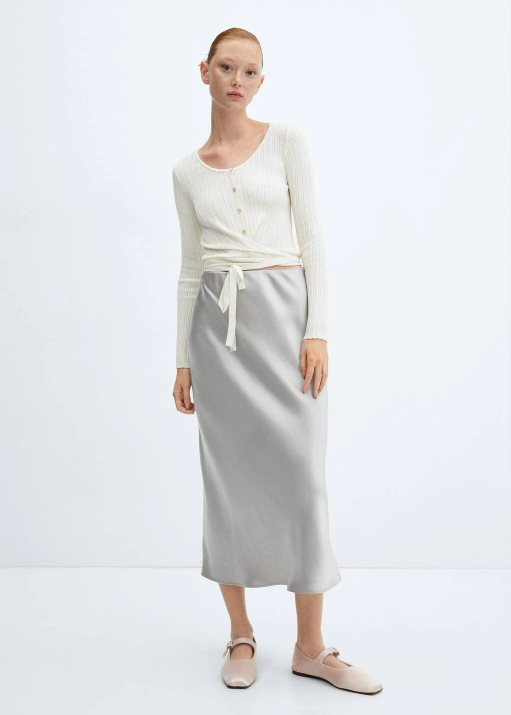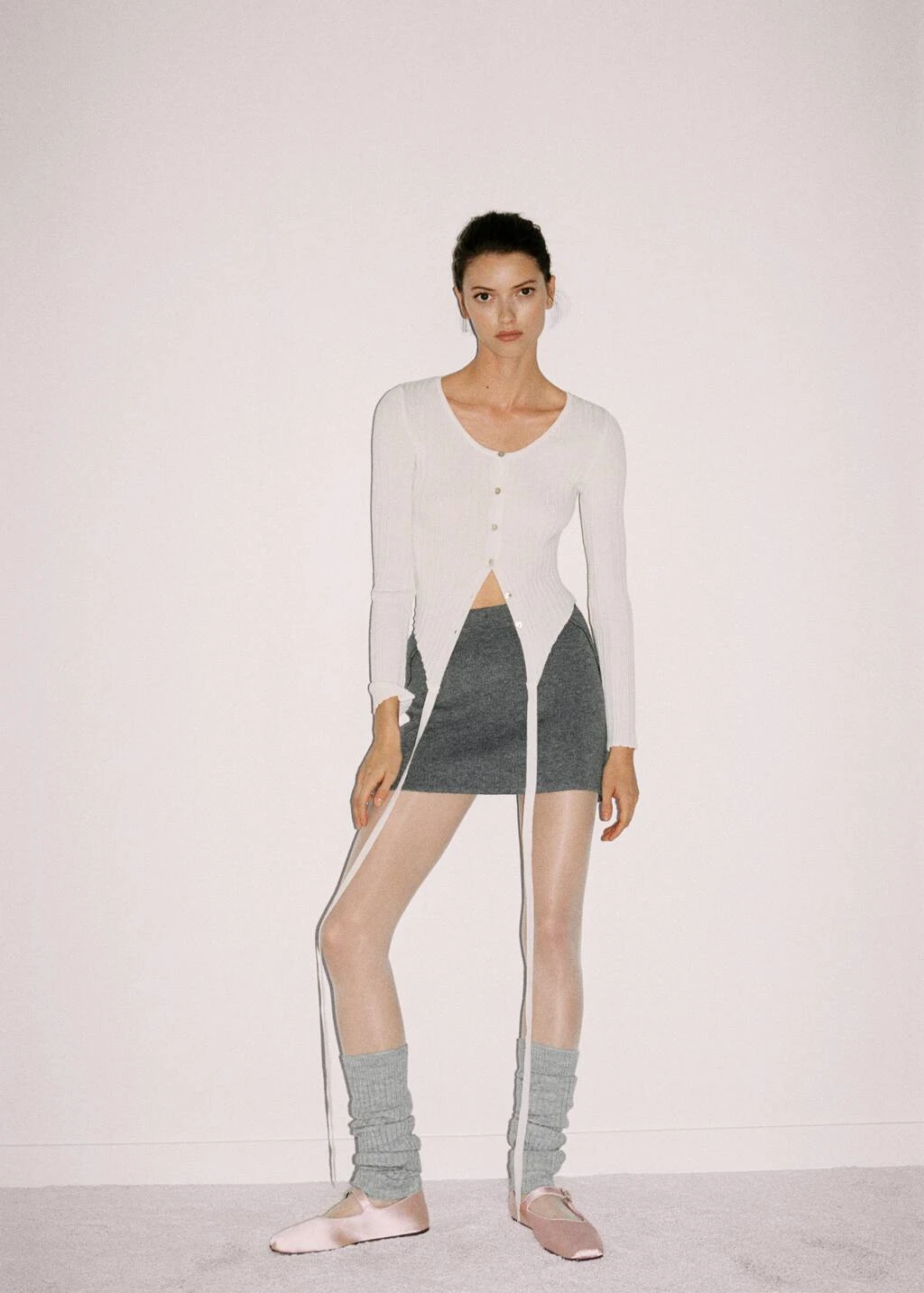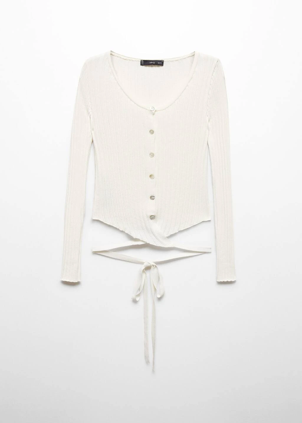 maille moyenne, maille cotelee, coupe courte, coupe cintree, col rond, manches longues, fermeture a boutons sur le devant, ruban a la taille avec fermeture a nœudComposition: 64% polyamide,36% viscose