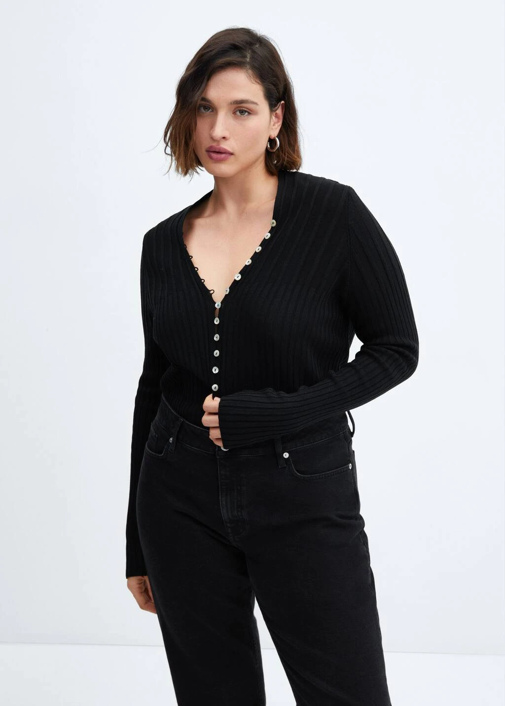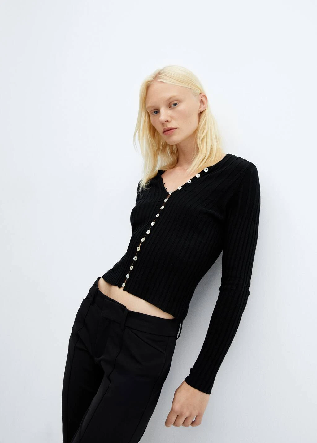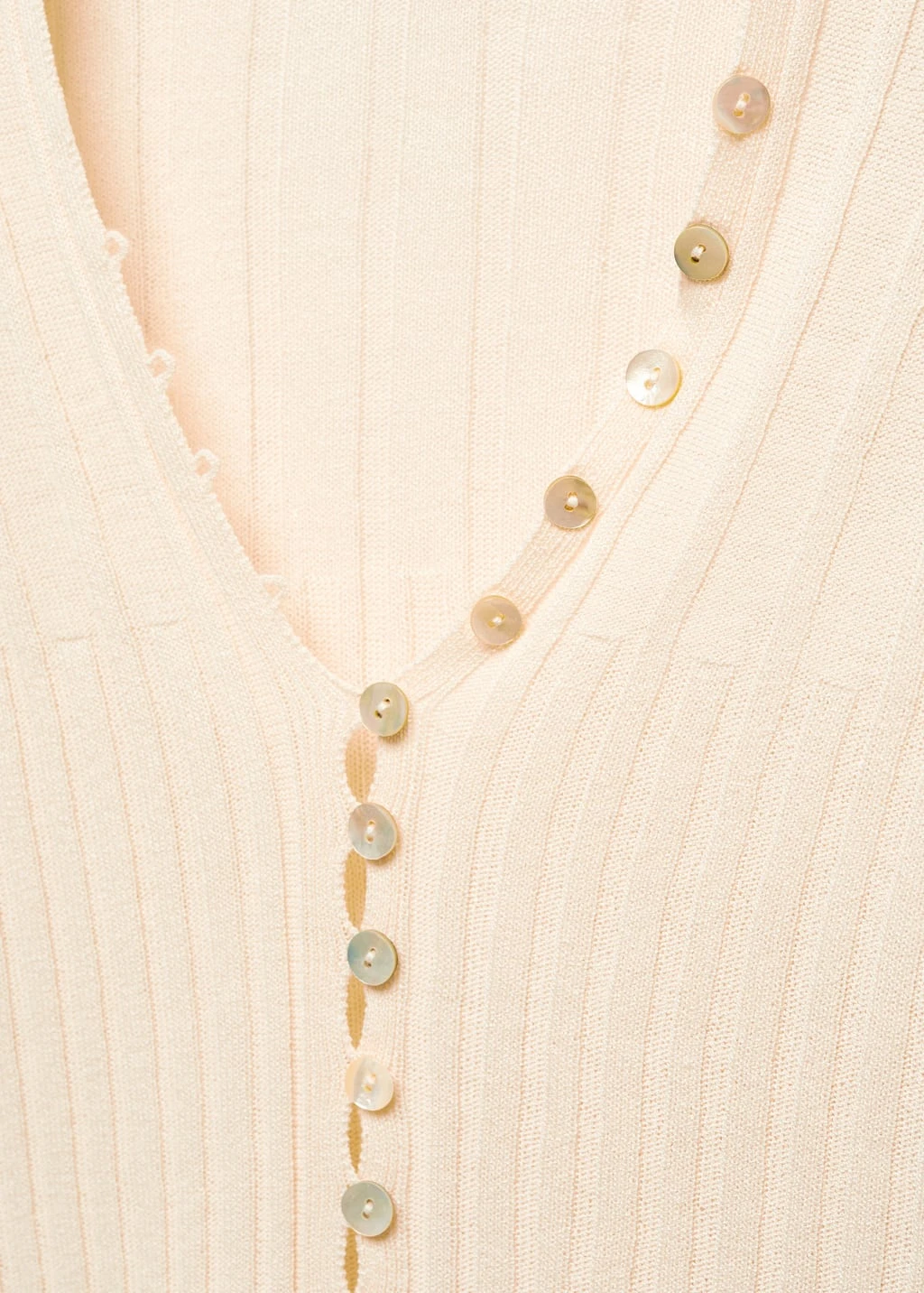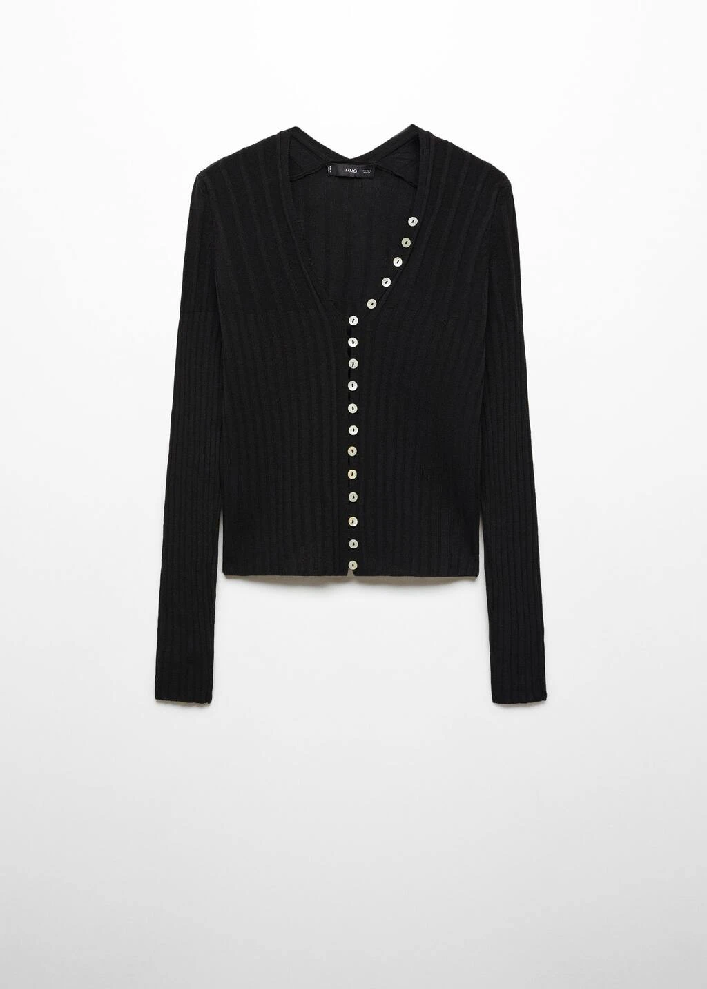 tissu en maille fine, design cotele, ajuste, col en v, manches longues, fermeture boutonnee sur le devantComposition: 100% acrylique