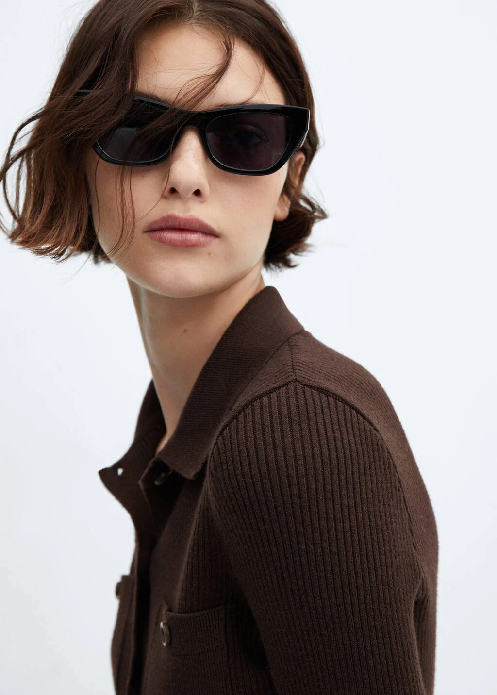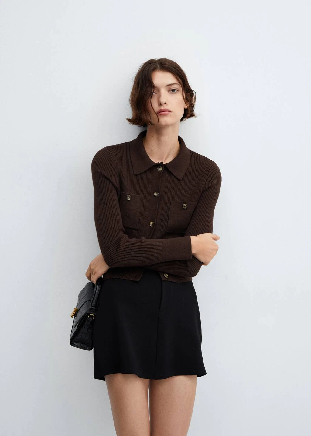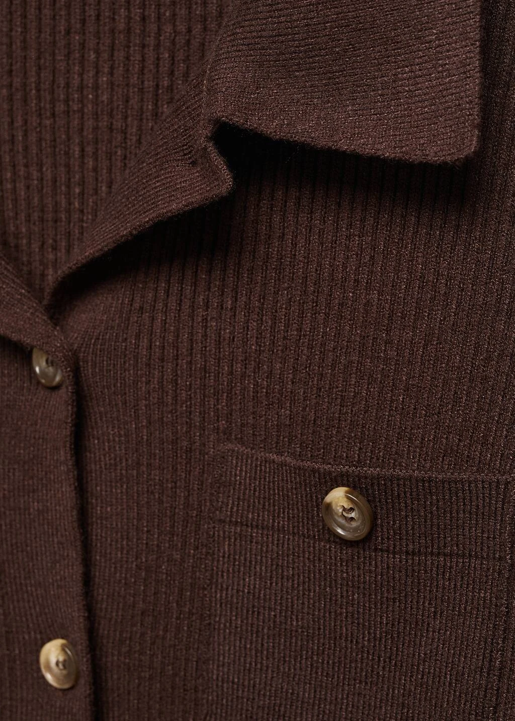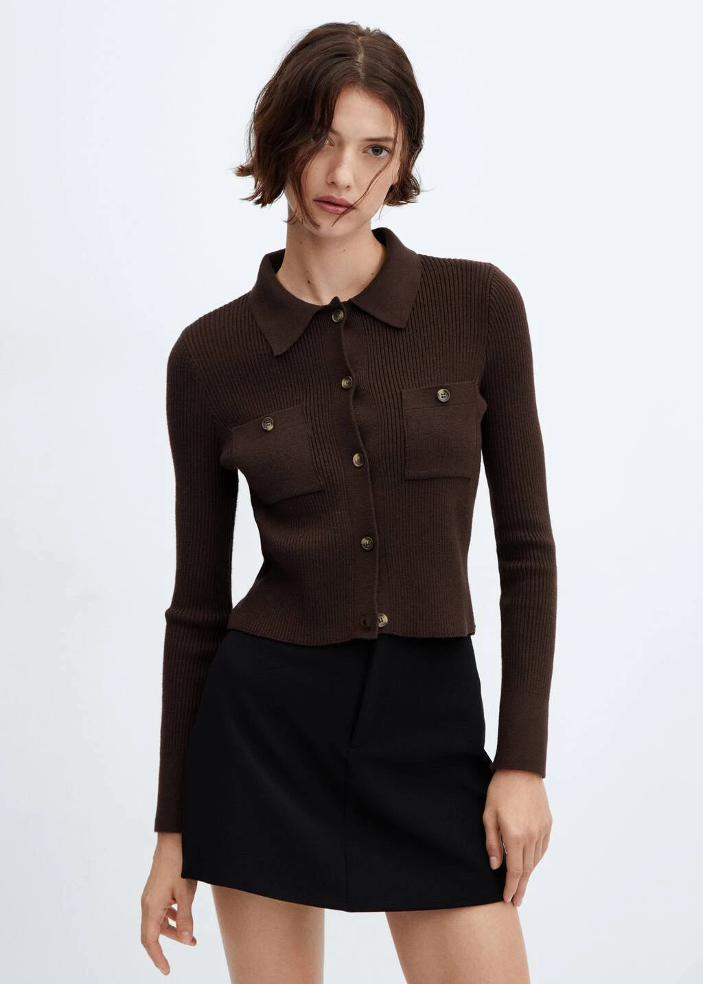 tissu en maille fine, coupe courte, ajuste, cotele, col chemise, manches longues, deux poches plaquees boutonnees sur la poitrine, fermeture a boutons sur le devant.Composition: 51% viscose,29% polyester,20% polyamide
