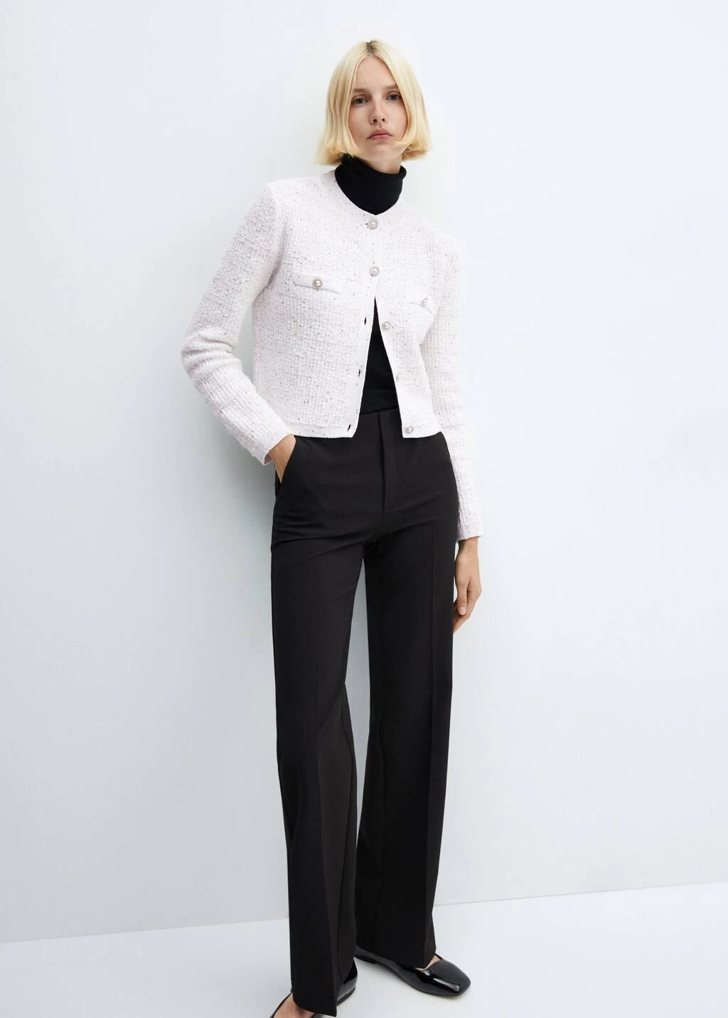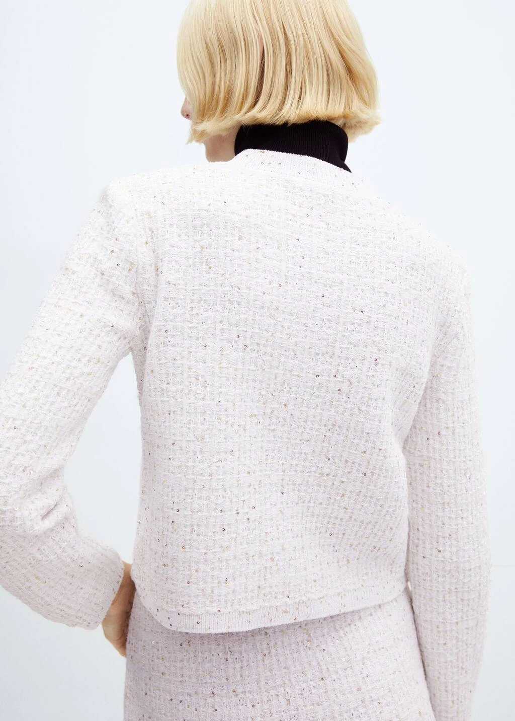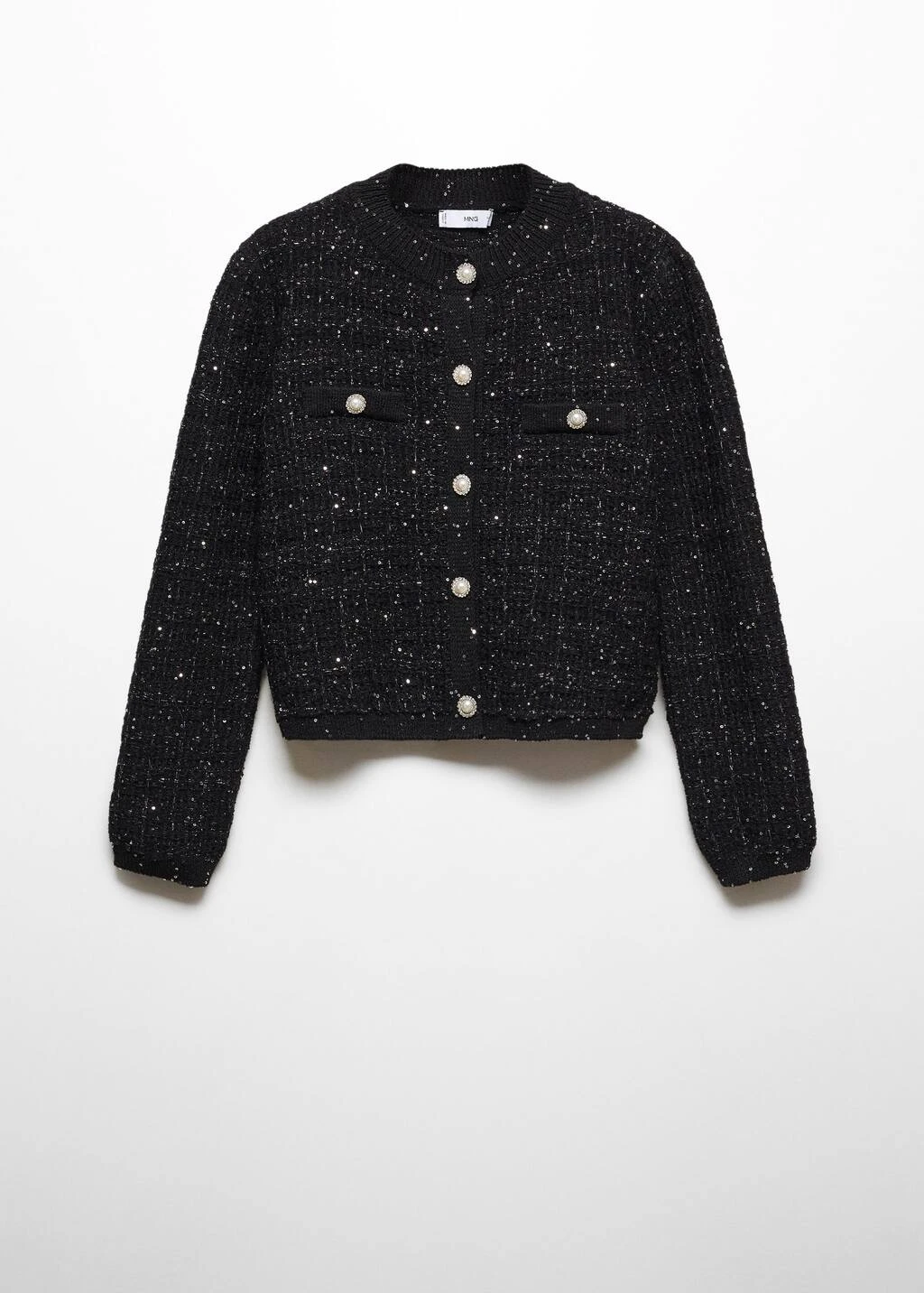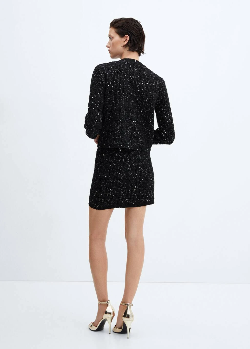 tissu en coton organique recycle melange, tissu tweed, maille moyenne, coupe droite, col rond, manches longues, poche passepoilee sur la poitrine, fermeture a boutons sur le devant, boutons effet bijoux, detail en sequins, disponible plus, total look.Composition: 49% polyester,43% coton,7% acrylique,1% polyester avec revêtement de cuivre
