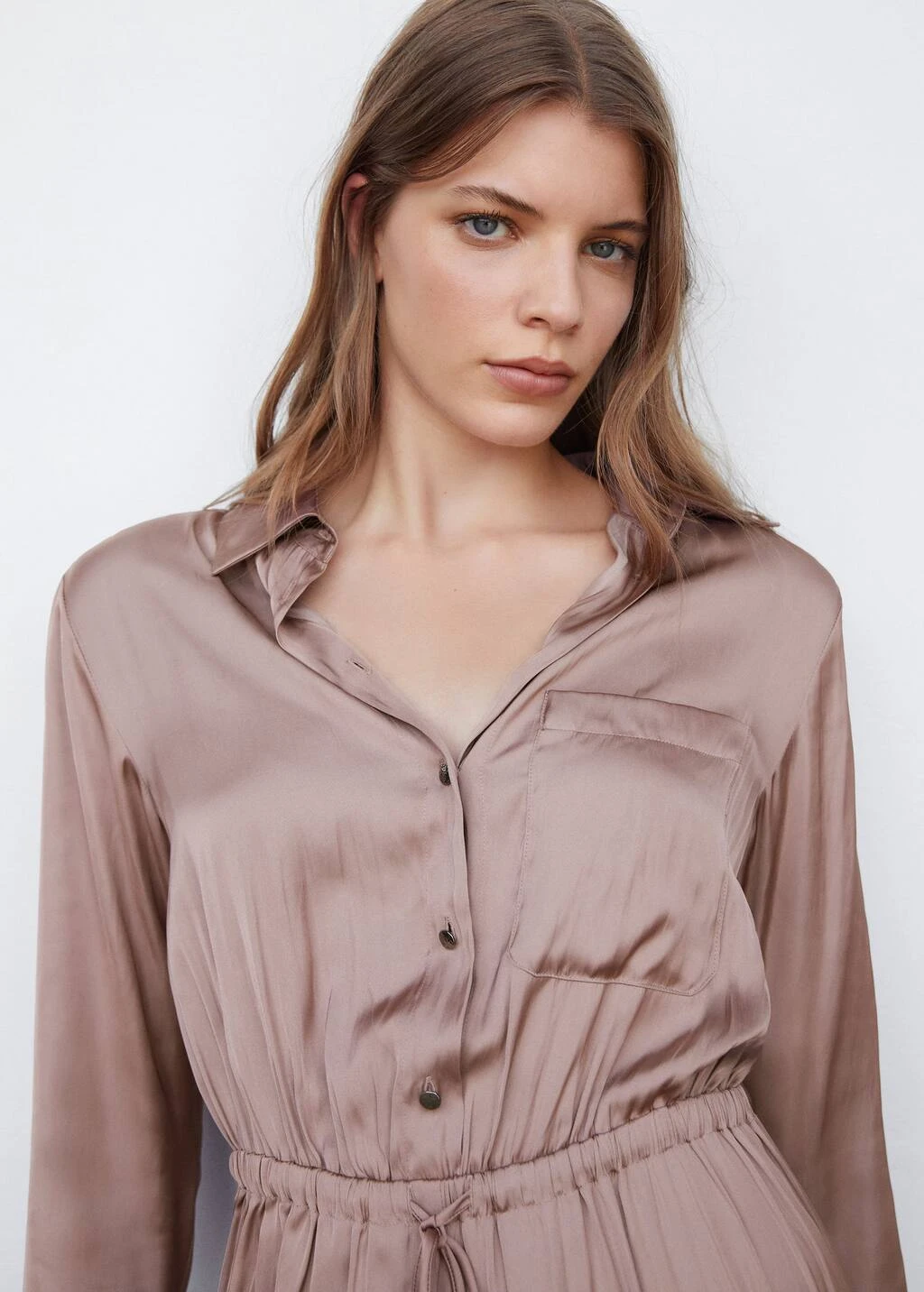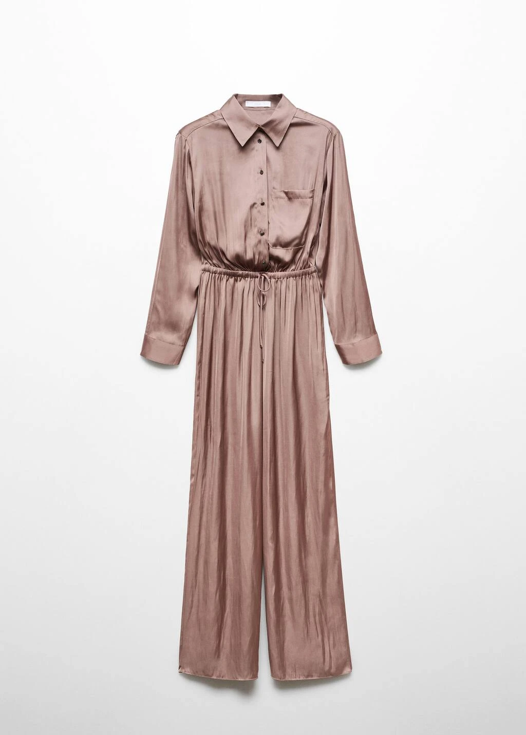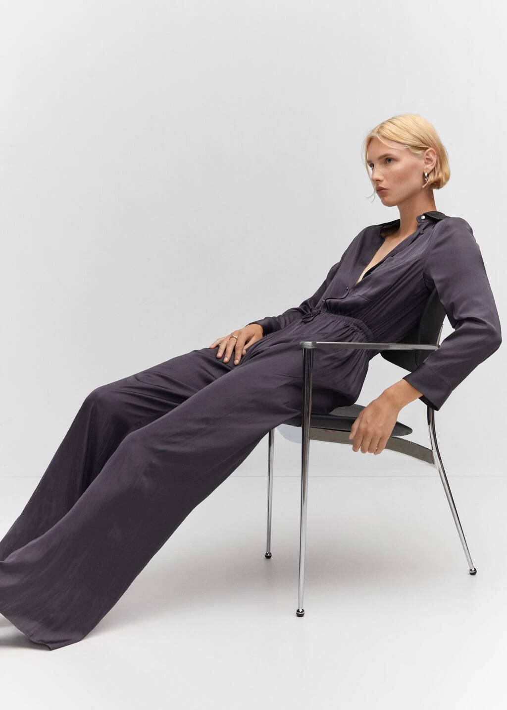 tissu satine, tissu fluide, style chemisier, coupe longue, coupe wideleg, coupe cintree, col chemise, manches longues avec poignets boutonnes, ceinture a nouer a la taille, fermeture boutonnee sur le devant, poche plaquee sur le devantComposition: 100% polyester. Cordon: 100% polyester