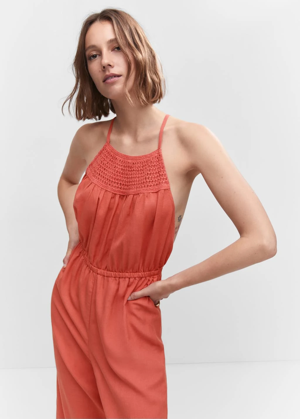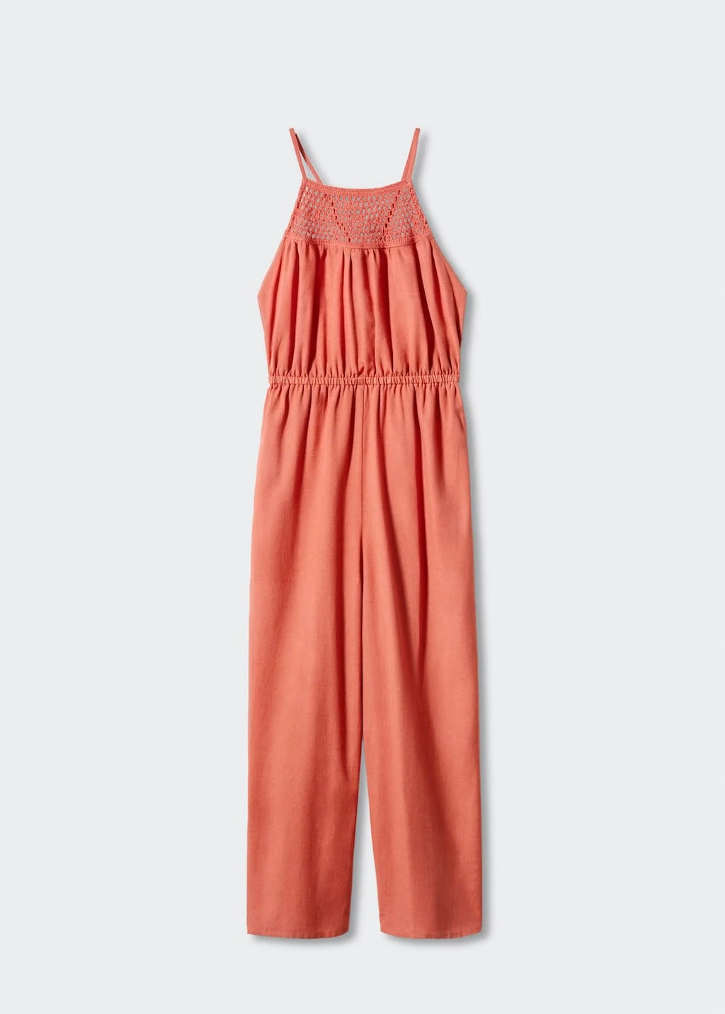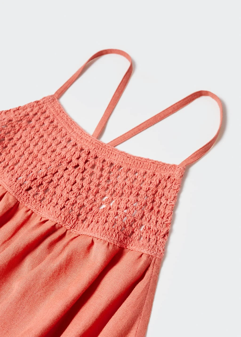 mini me, tissu fluide, coupe droite, style crop, emmanchures americaines, bretelles fines ajustables, bretelles croisees dans le dos, taille elastique, sans fermeture, detail en crochet, ce vetement est egalement disponible dans la collection kids girl. Composition: 57% viscose,31% coton,12% lin. Empiècement: 100% coton