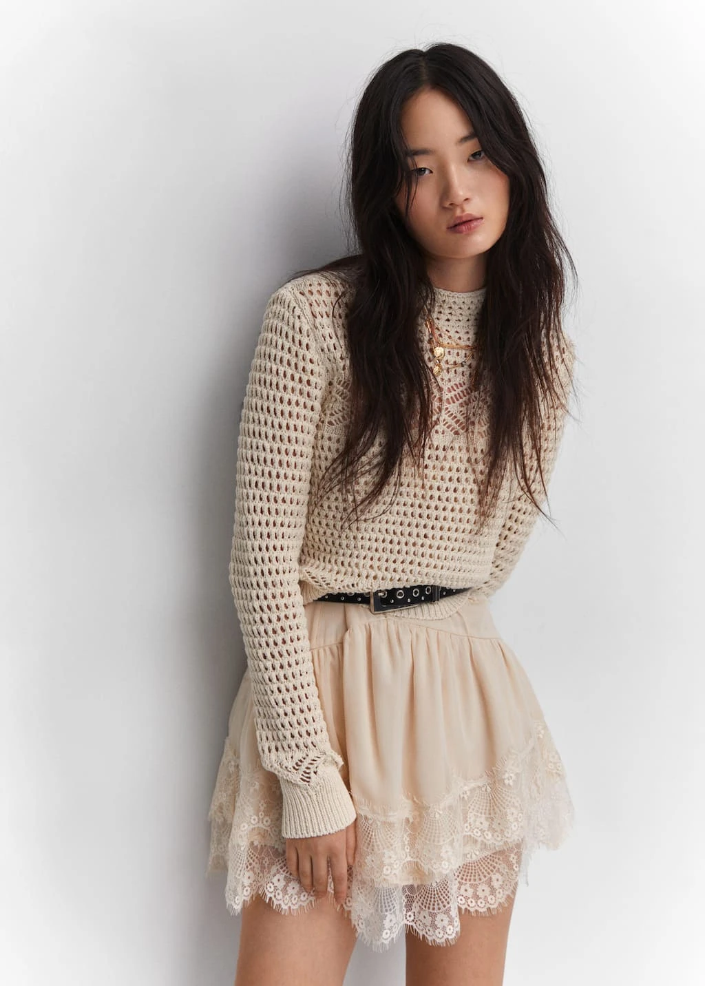 tissu en grosse maille, tissu en maille ajouree, droit, col montant, manches longues, poignets elastiques, sans fermeture, style bohoComposition: 50% coton,50% polyester
