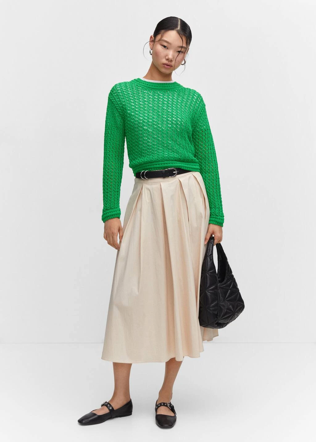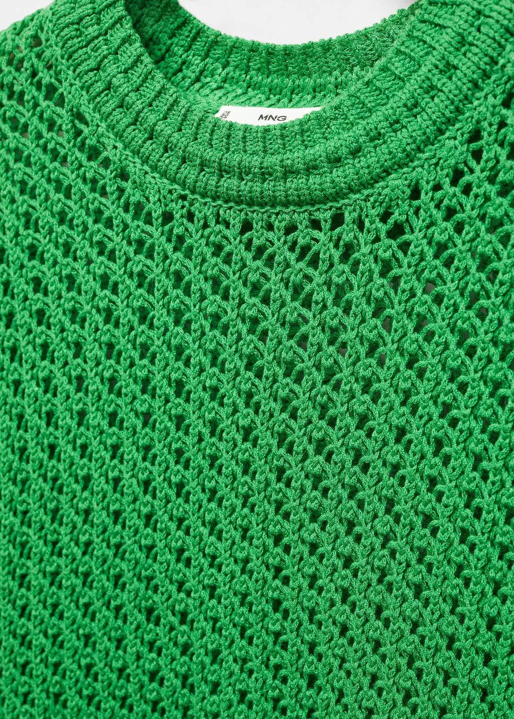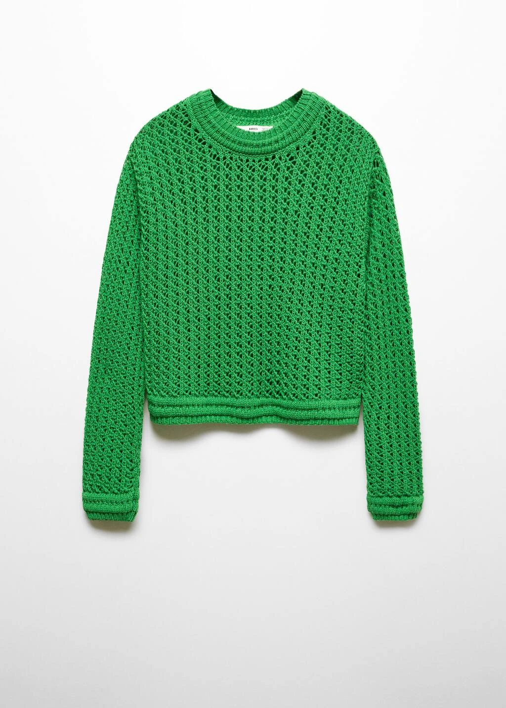 tissu en crochet, maille moyenne, coupe droite, coupe courte, col rond, manches longues, bords coteles contrastes au niveau du col, des manches et sur le basComposition: 100% acrylique