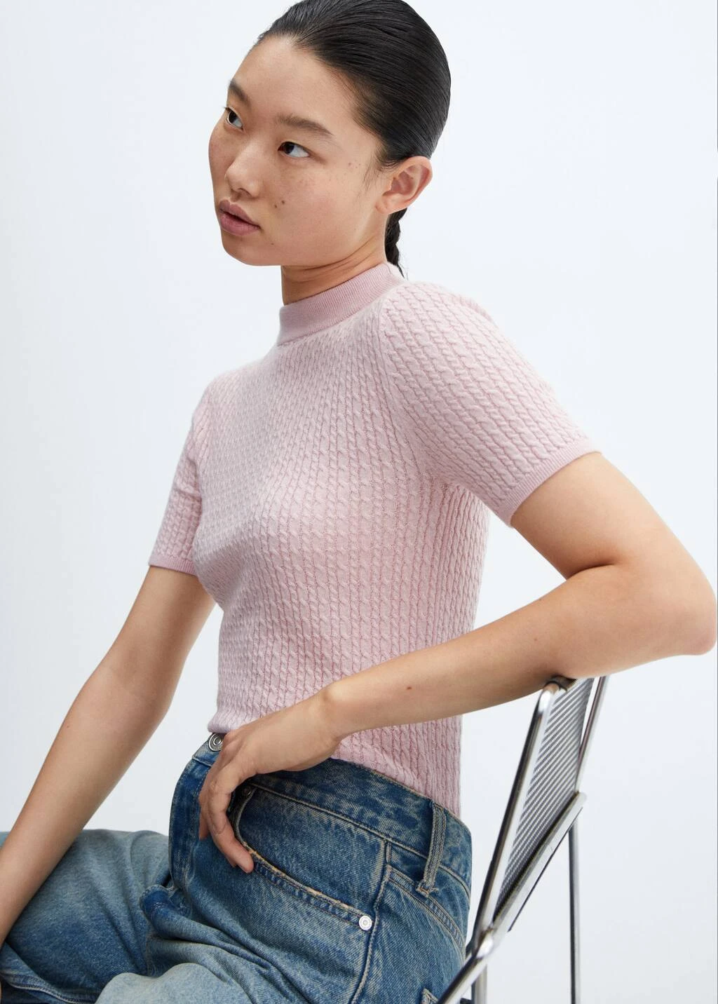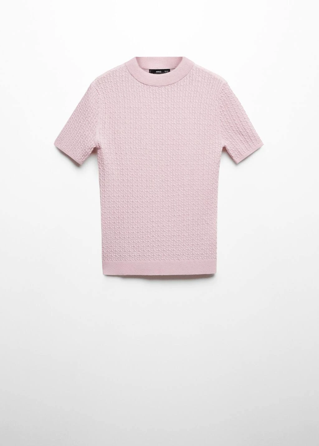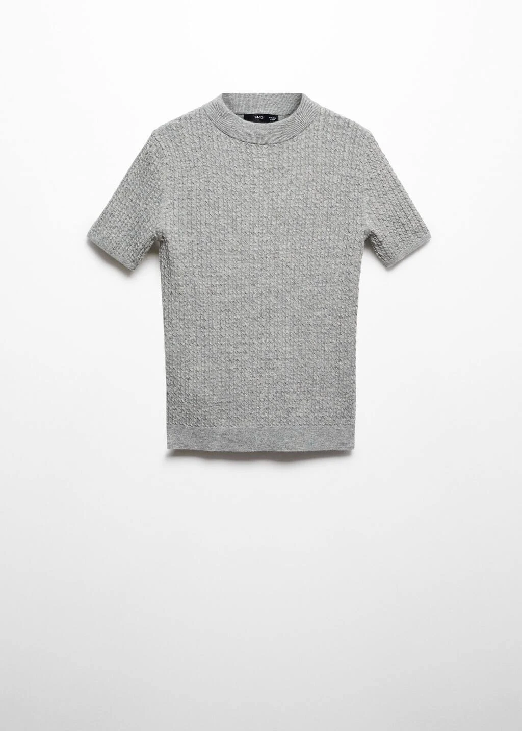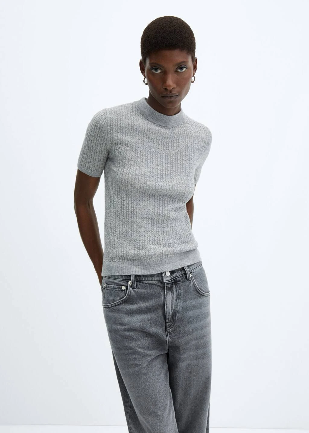 tissu en maille fine, tissu maille torsadee, tissu melange de laine recyclee, coupe cintree, col rond, manches courtes, bords cotelesComposition: 45% laine,26% polyamide,23% viscose,6% cashmere