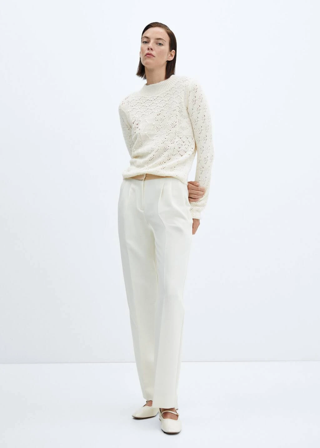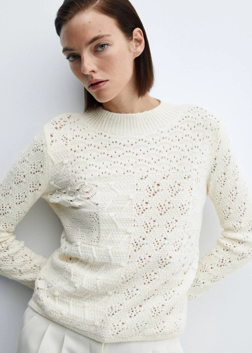 tissu en maille ajouree, tissu en crochet, maille moyenne, coupe droite, col rond, manches longues, sans fermetureComposition: 81% acrylique,12% polyamide,7% polyester