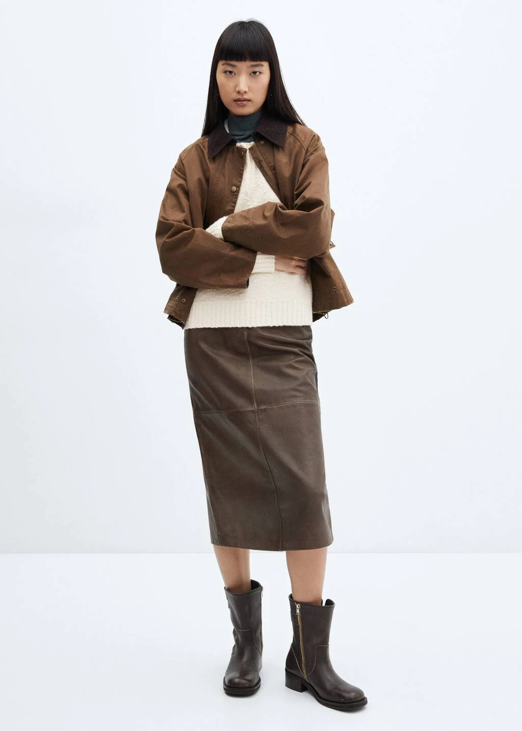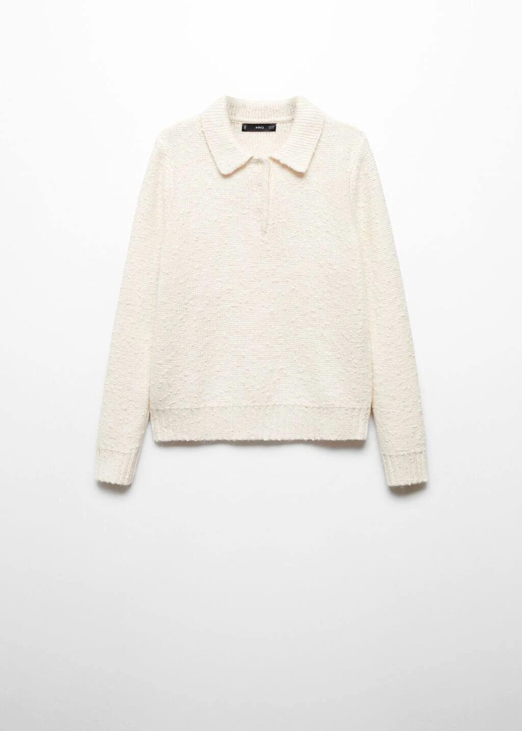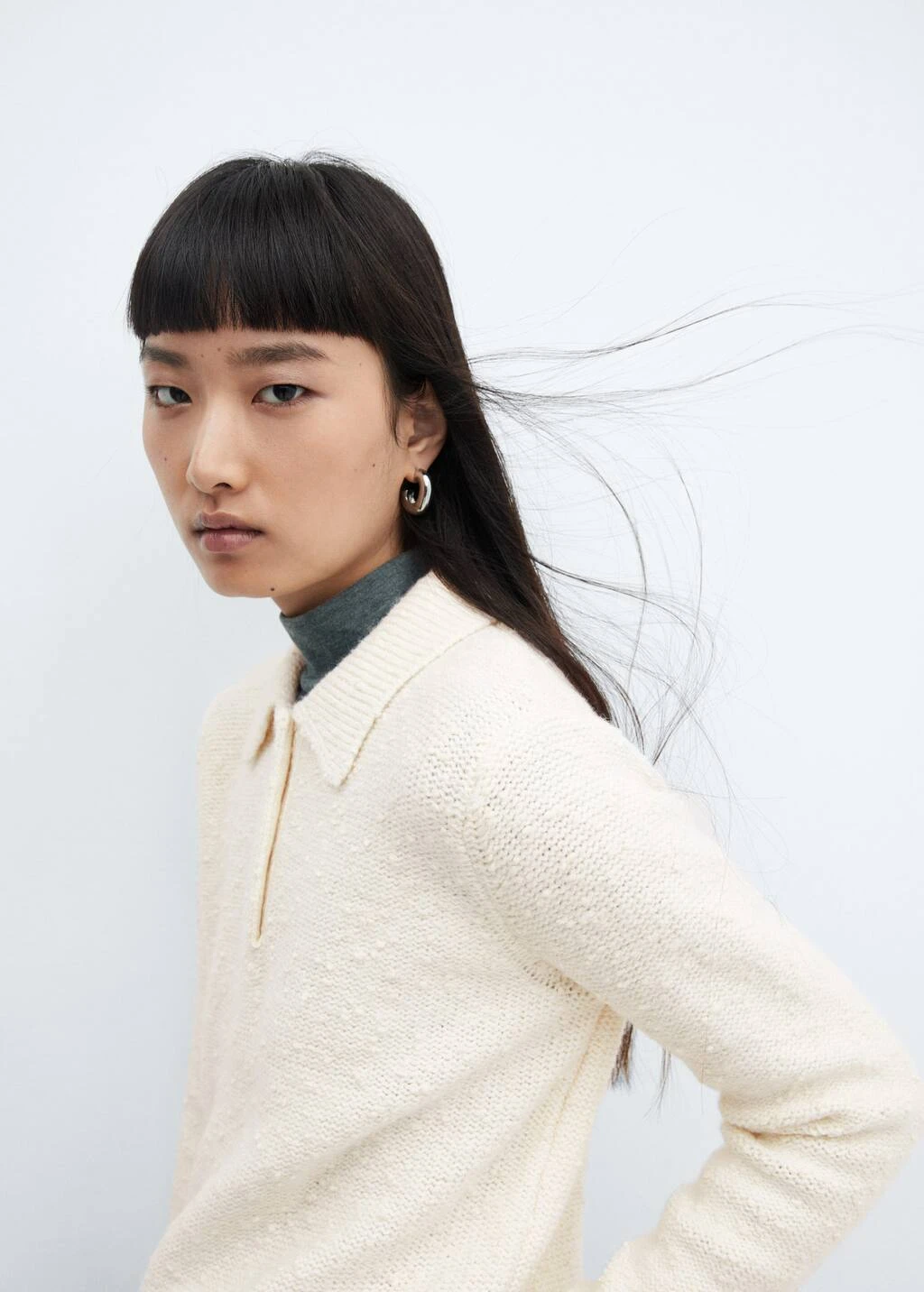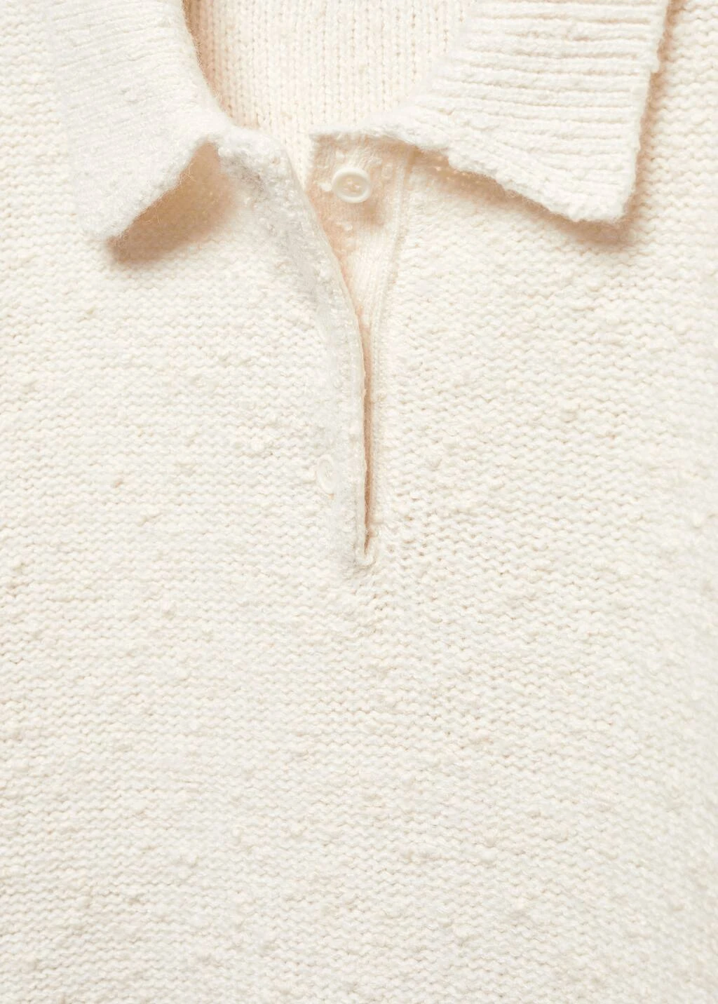 tissu de coton melange, tissu de laine melange, tissu en grosse maille, coupe droite, texture, col polo, manches longues, bords coteles au niveau du col, des manches et sur le basComposition: 52% polyester,44% coton,4% laine