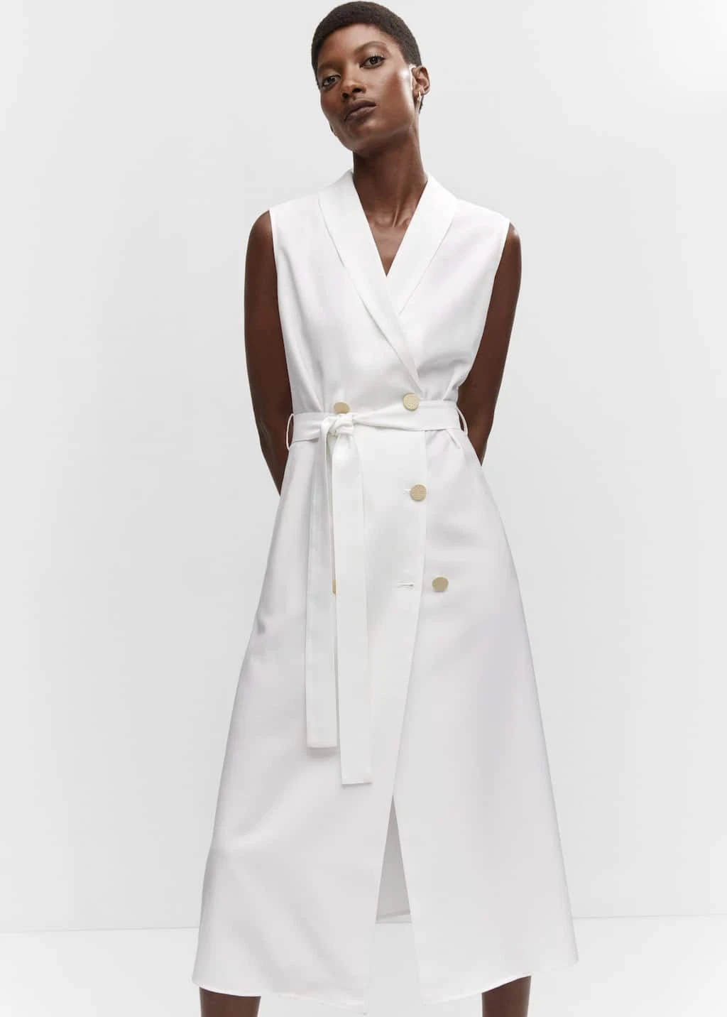 tissu fluide, croise, droit, coupe midi, col en v avec rabat, sans manches, fermeture boutonnee sur le devant, nœud a la taille, doublureComposition: 93% viscose,7% polyester. Doublure: 83% polyester,17% coton. Ceinture: 93% viscose,7% polyester