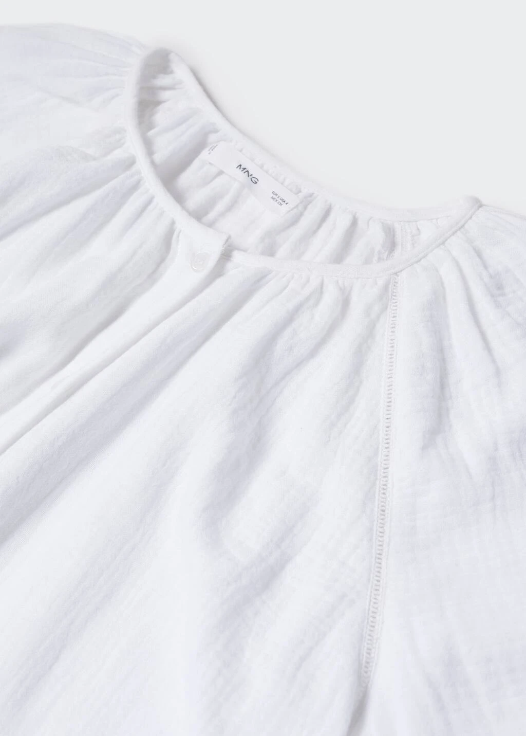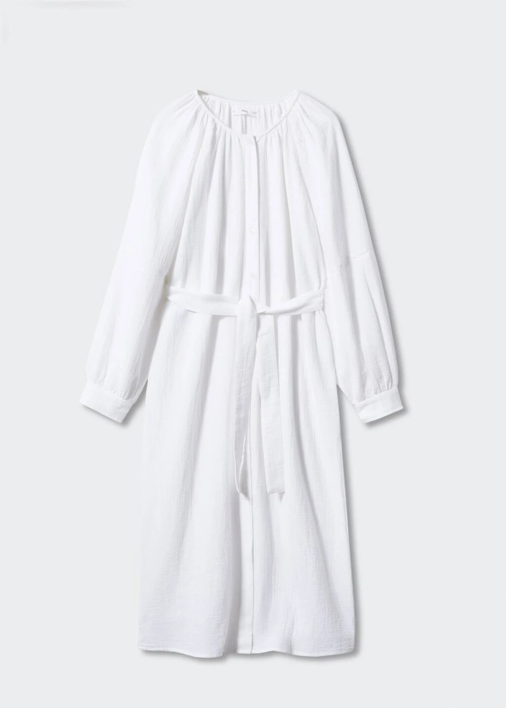 tissu 100 % coton, tissu plisse, tissu texture, coupe droite, coupe midi, col rond, manches longues boutonnees, fermeture boutonnee sur le devant, ceinture a nouer a la taille, ouverture sur le devant, details brodesComposition: 100% coton