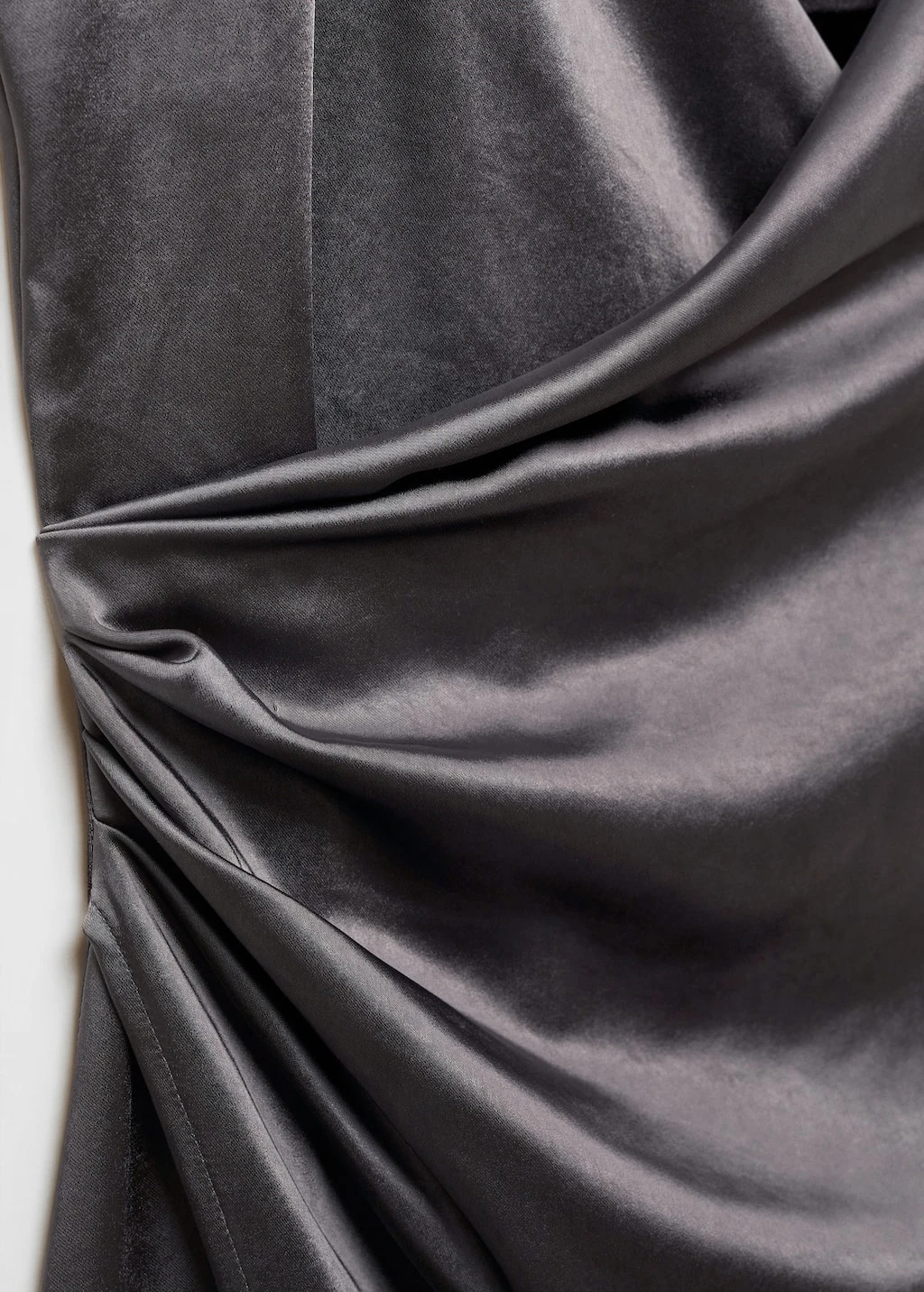 tissu satine, tissu fluide, matiere drapee, croise, coupe courte, coupe cintree, col cache-cœur en v, bretelles fines ajustables, fermeture eclair invisible sur le cote, collection fetes et ceremoniesComposition: 100% polyester