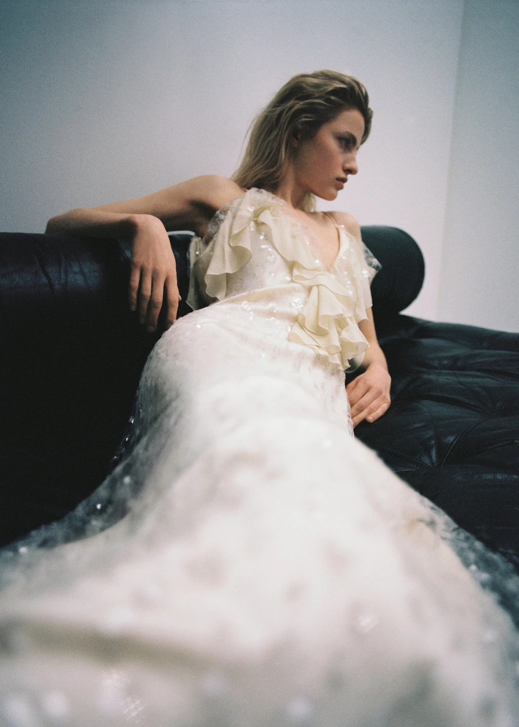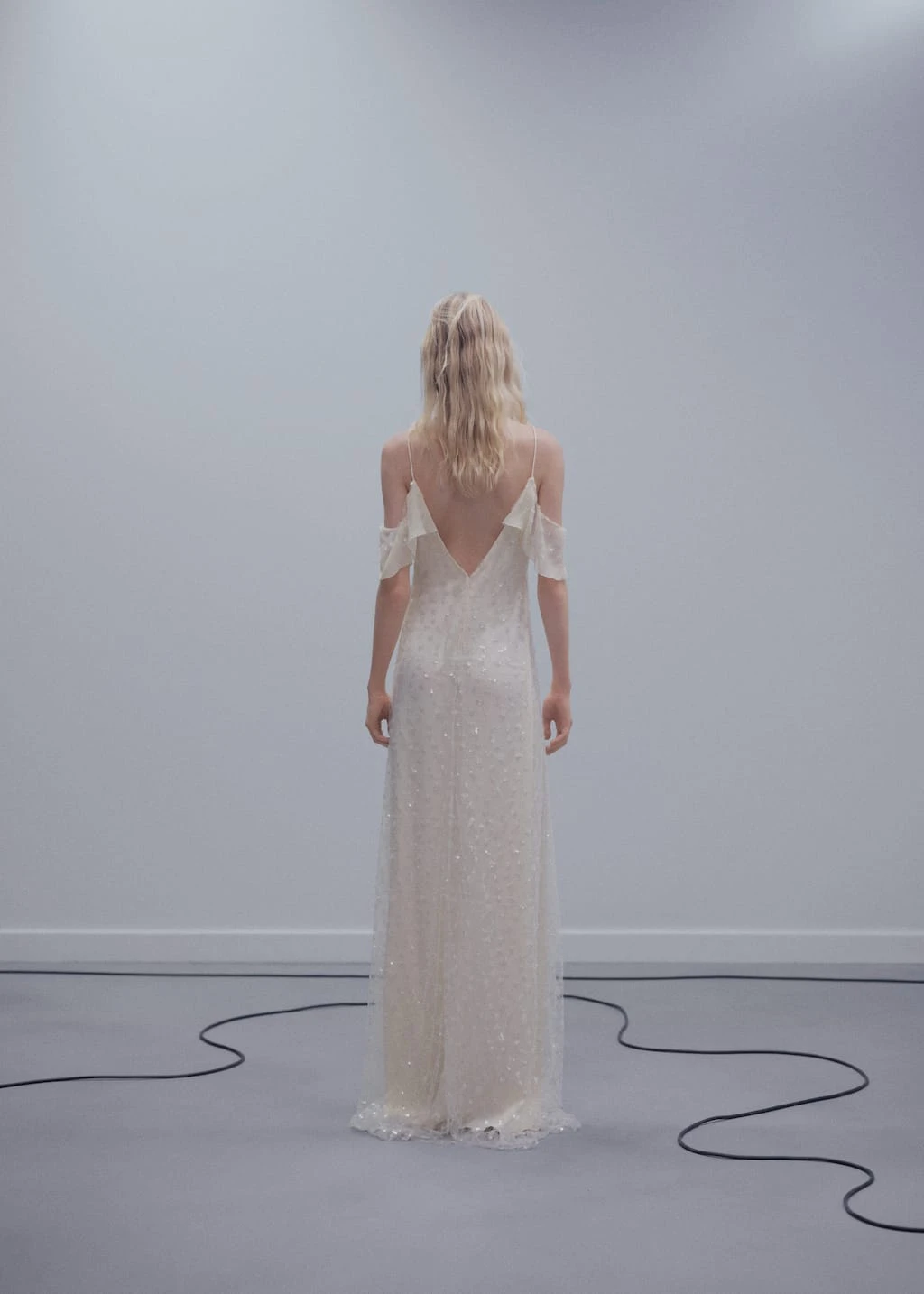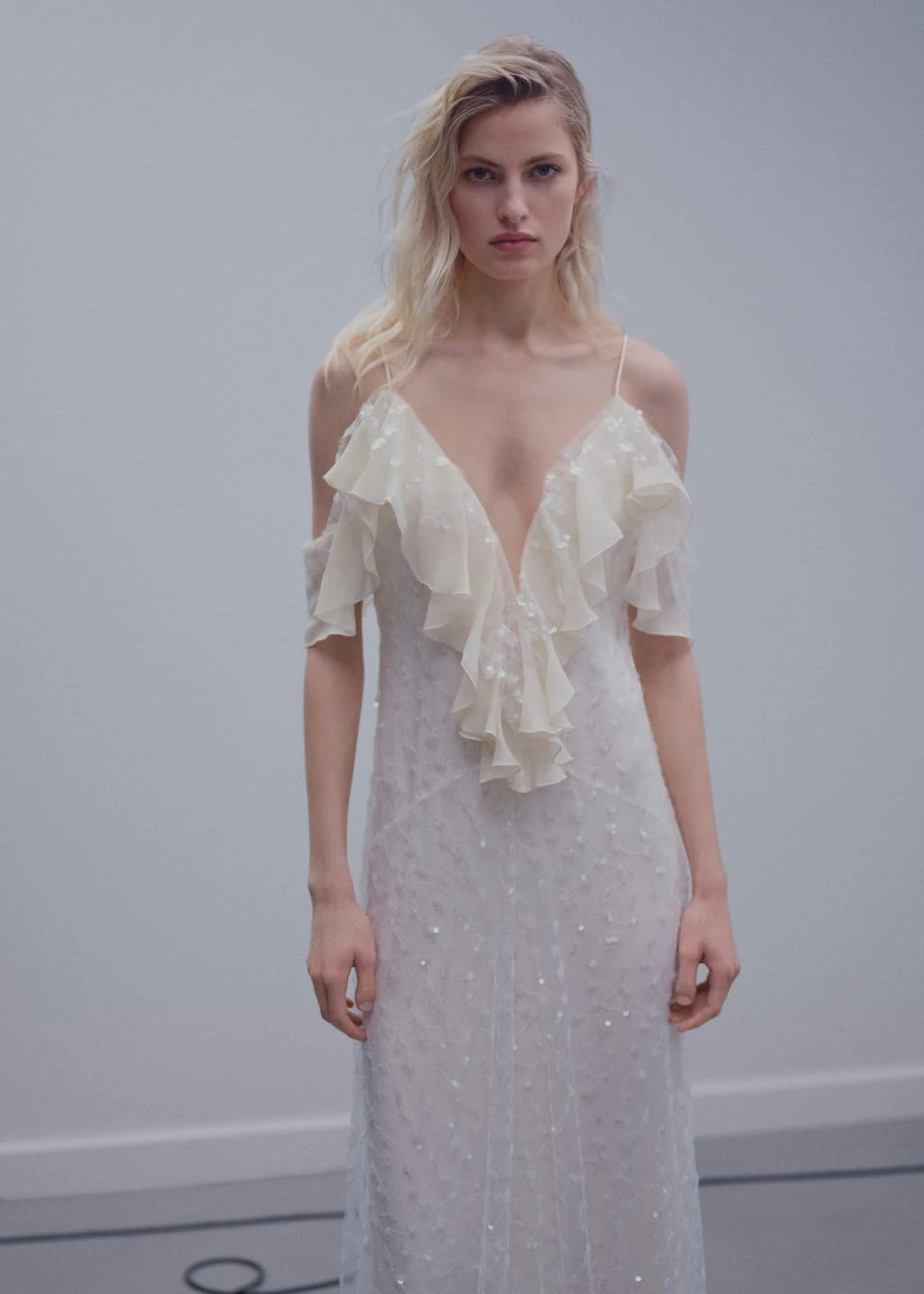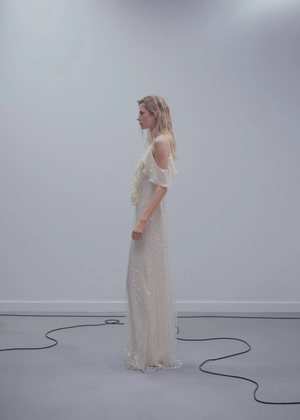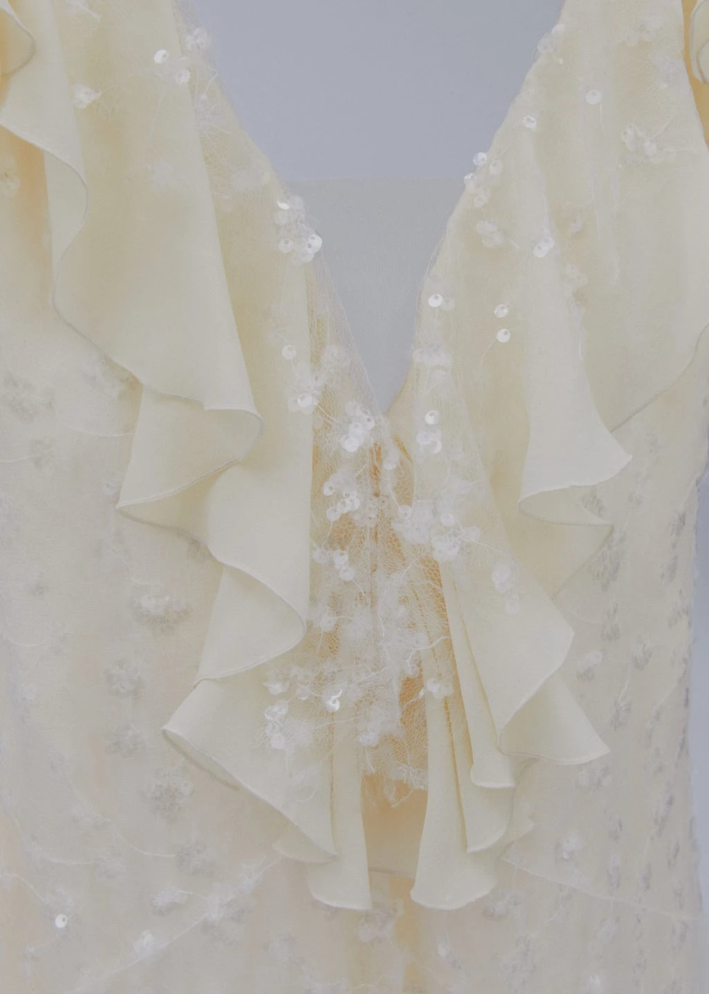 la piece blanche de style lingerie se reinvente : avec une couche de tissu en gaze par-dessus, l’encolure a volants et les details a sequins, elle devient une piece speciale et unique, tissu en polyamide recycle, evase, coupe longue, col en v, detail volante, bretelles fines, fermeture eclair a l’arriere, detail en sequins, fabrique au maroc, collection fetes et ceremonies, capsule : une collection de vetements en edition limitee, fabriques avec les meilleurs tissus et le plus grand soin en matiere de patrons, afin d’obtenir les meilleures finitions. cette collection exclusive est concue pour les evenements et les occasions les plus chics.Composition: 100% polyamide recyclé. Doublure: 100% viscose. Volants: 100% soie. Sequin: 100% poly(téréphtalate d’éthylène)