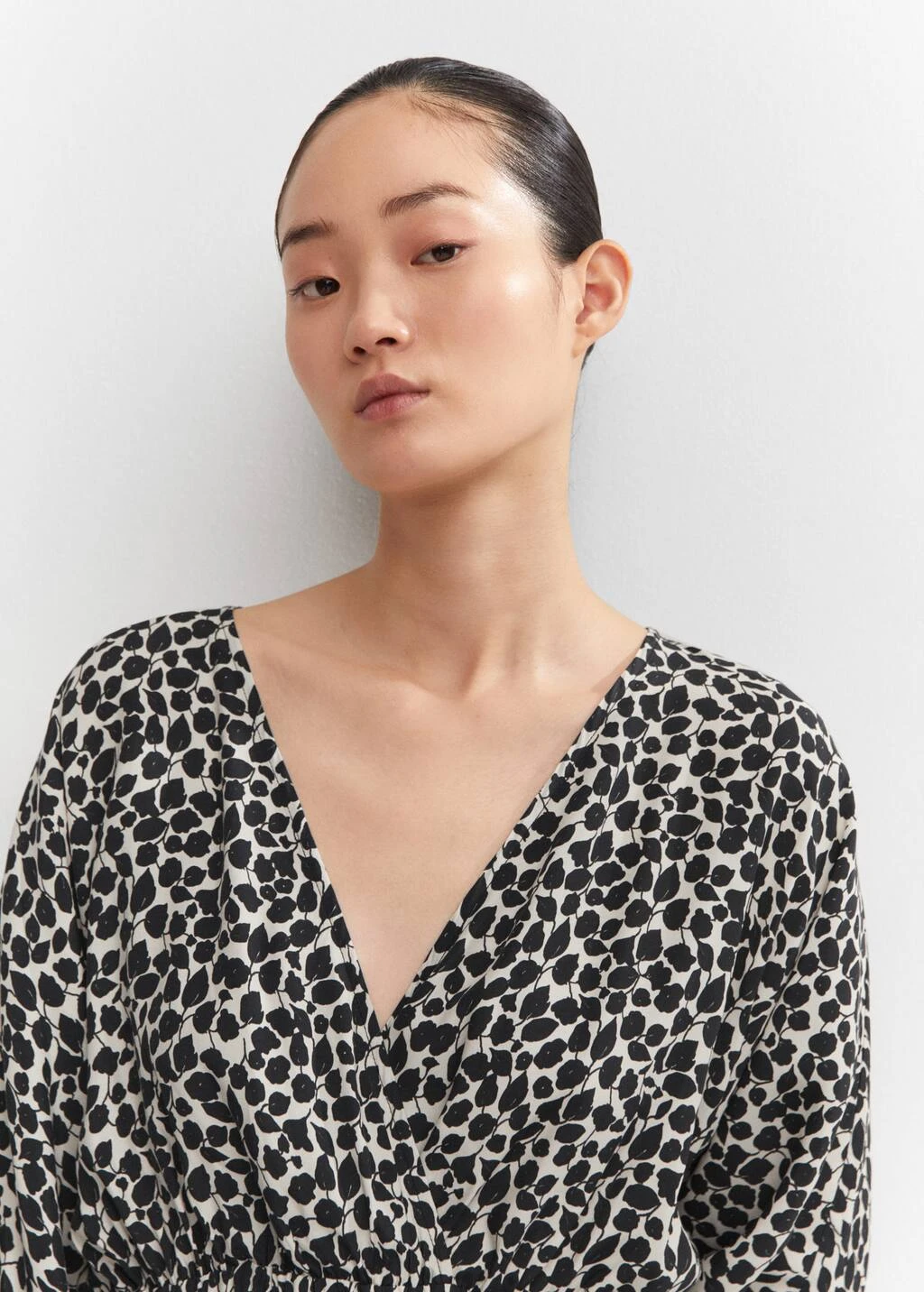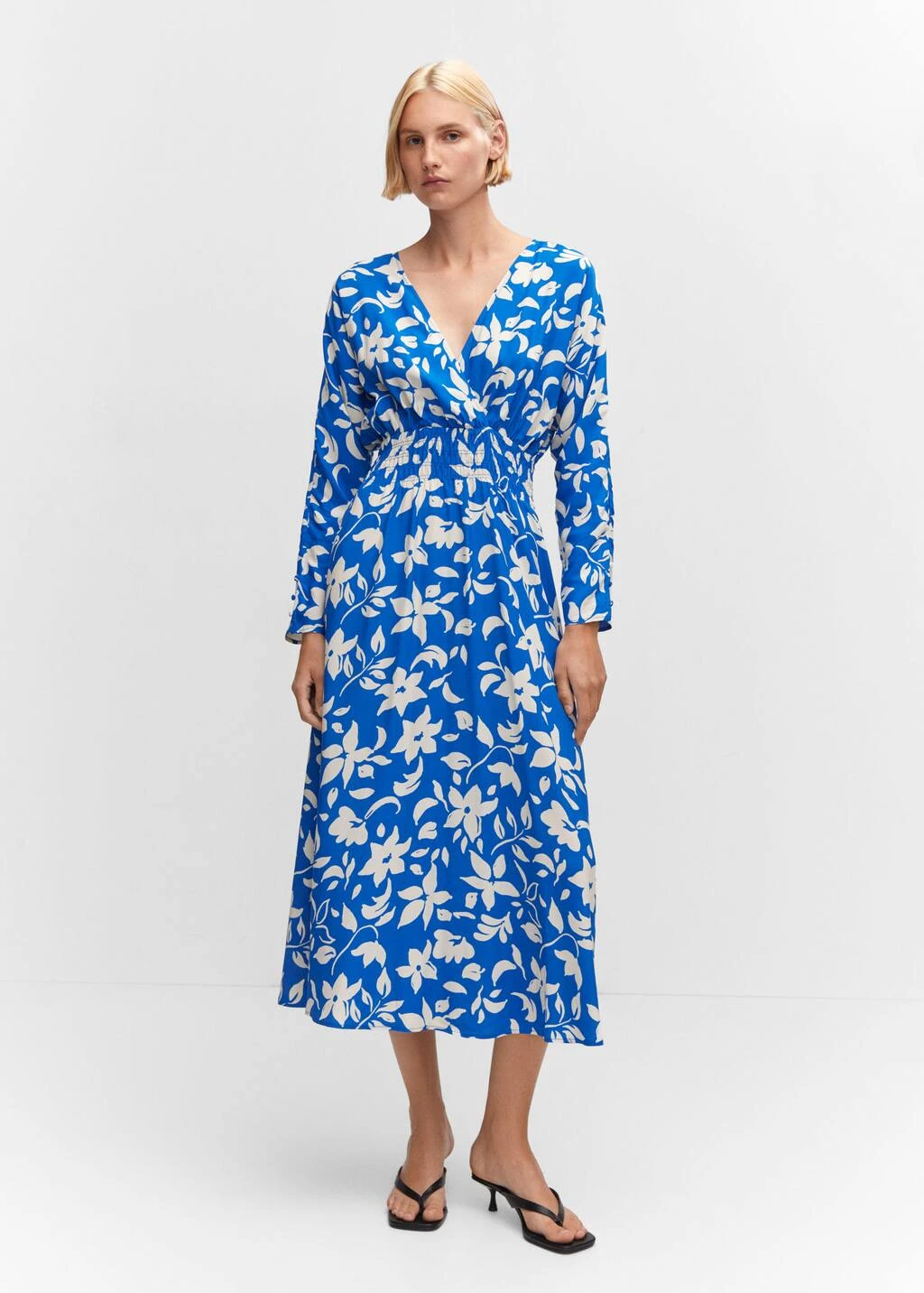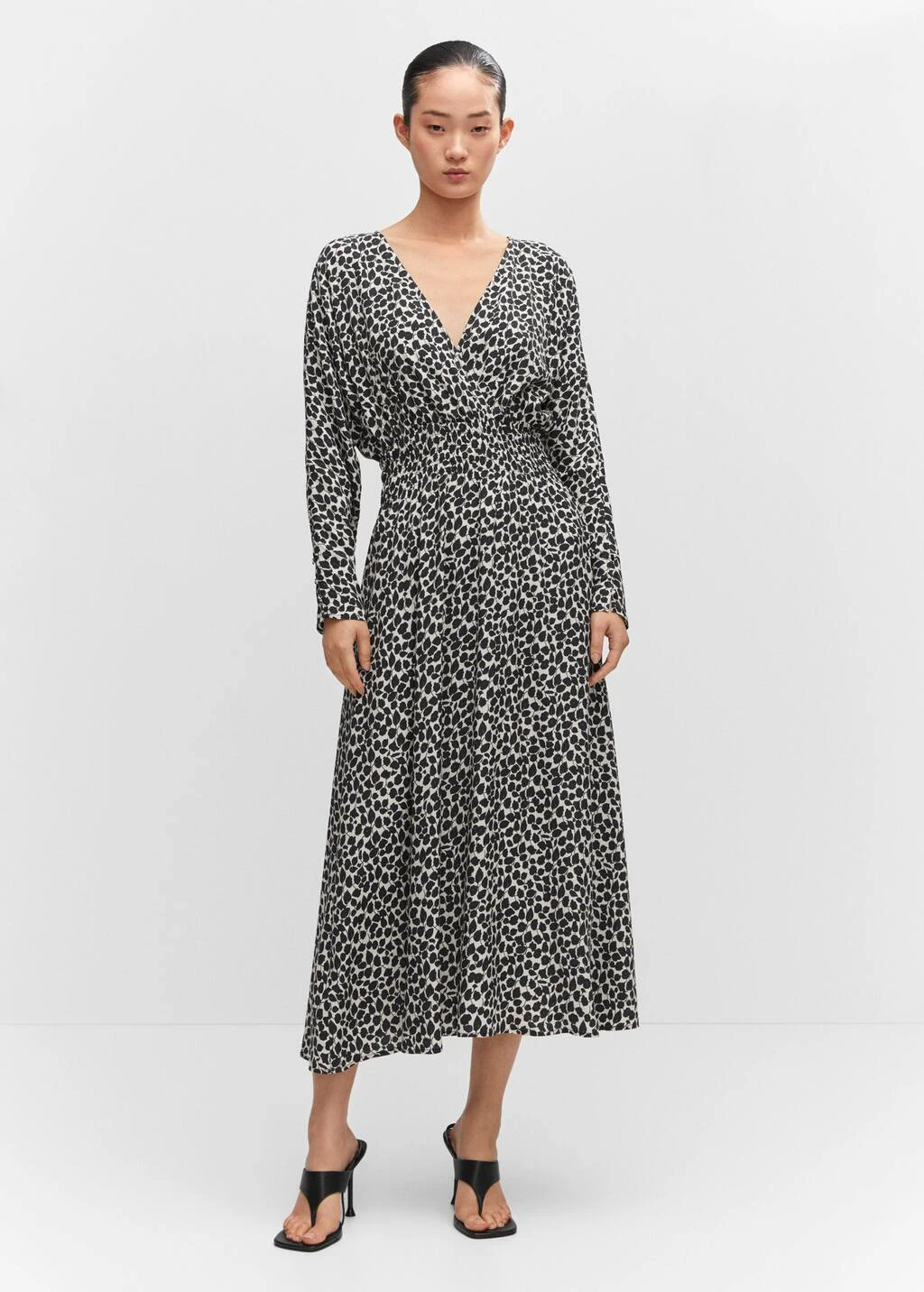 tissu fluide, croise, evase, coupe longue, imprime, col croise, manches longues, fronce elastique a la taille, sans fermetureComposition: 100% viscose