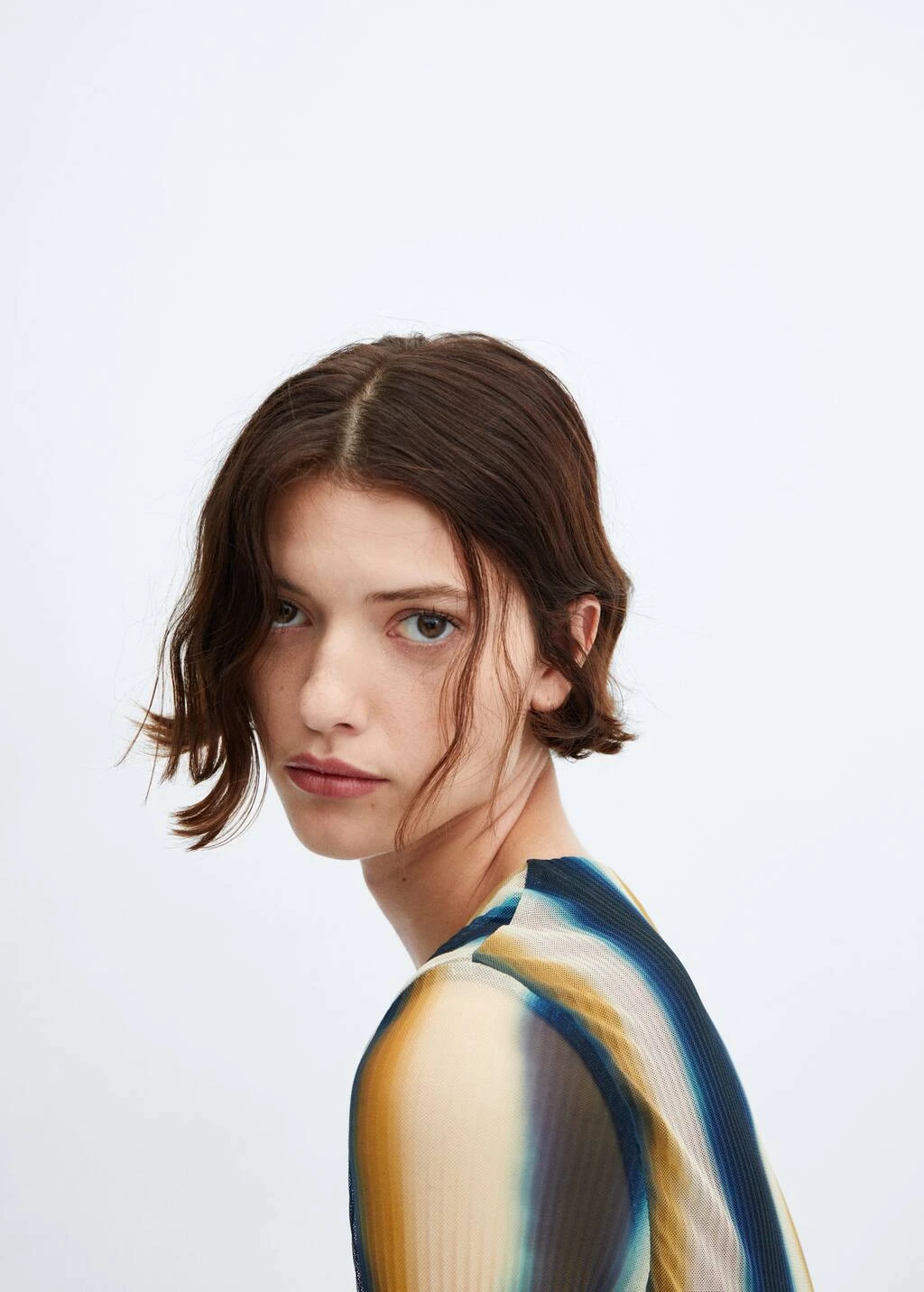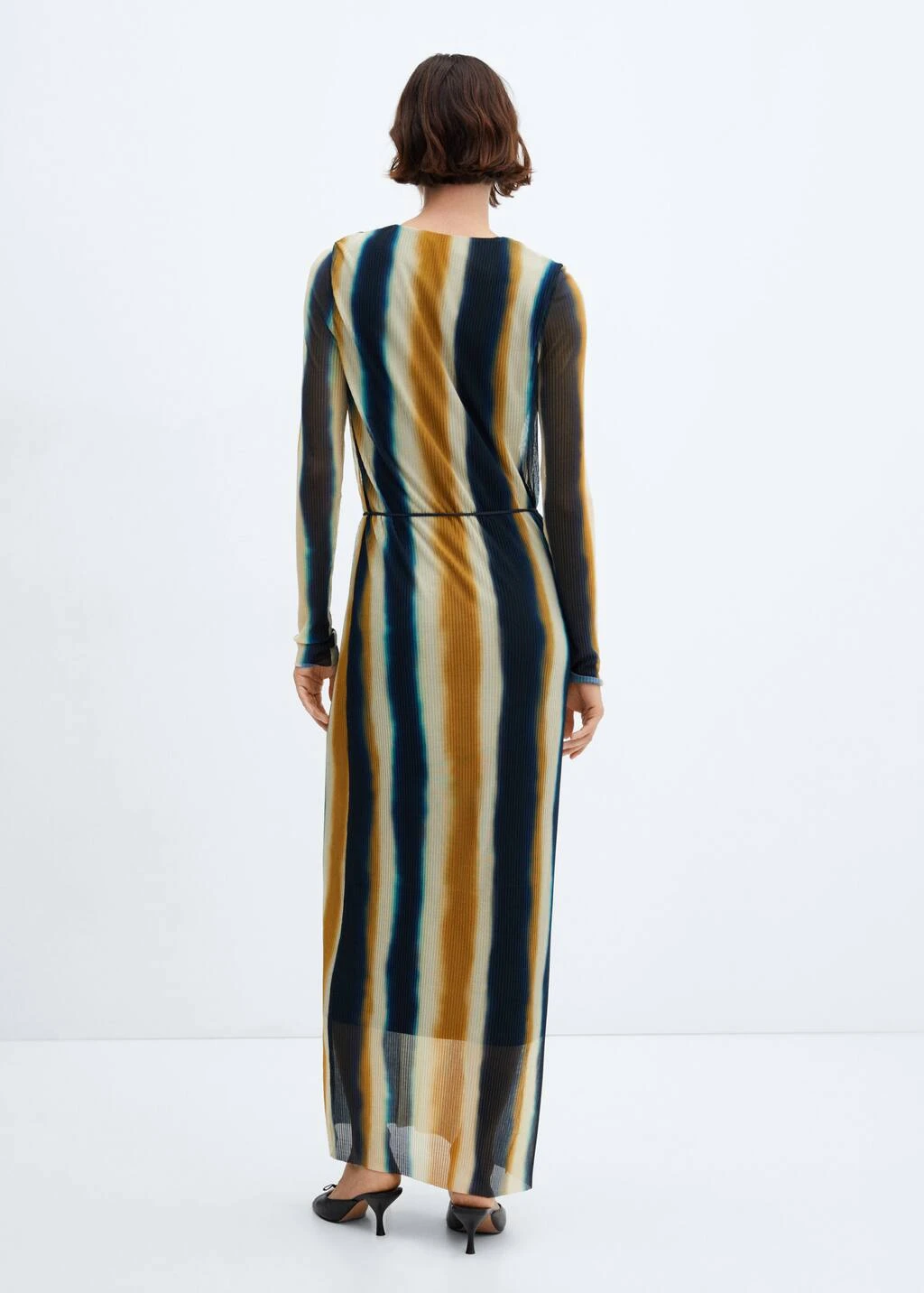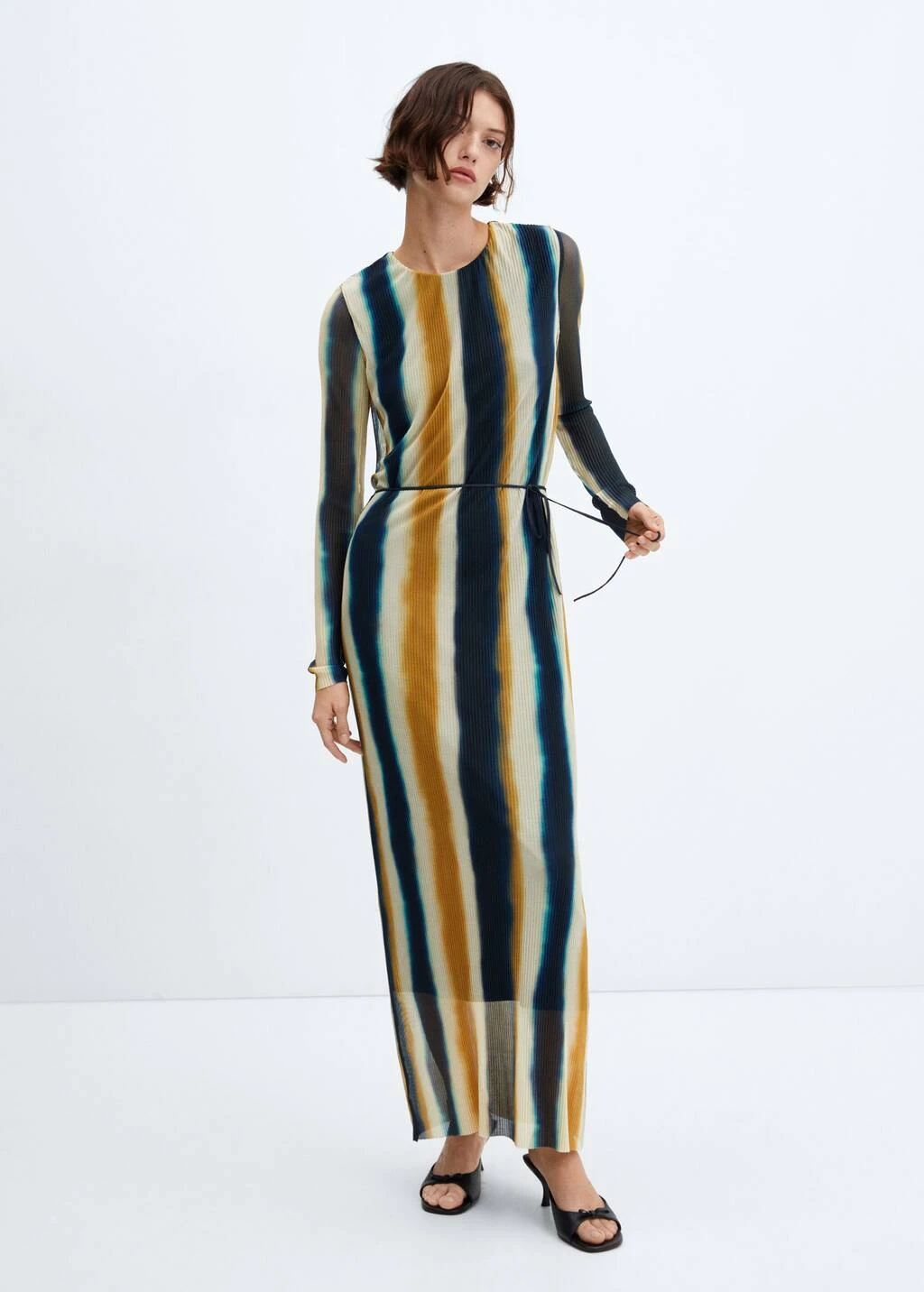 tissu en maille filet, coupe longue, ajuste, design plisse, imprime a rayures tie-dye, col rond, manches longues, sans fermeture, detail corde decorative, doublureComposition: 95% polyester,5% elasthanne. Doublure: 100% polyester