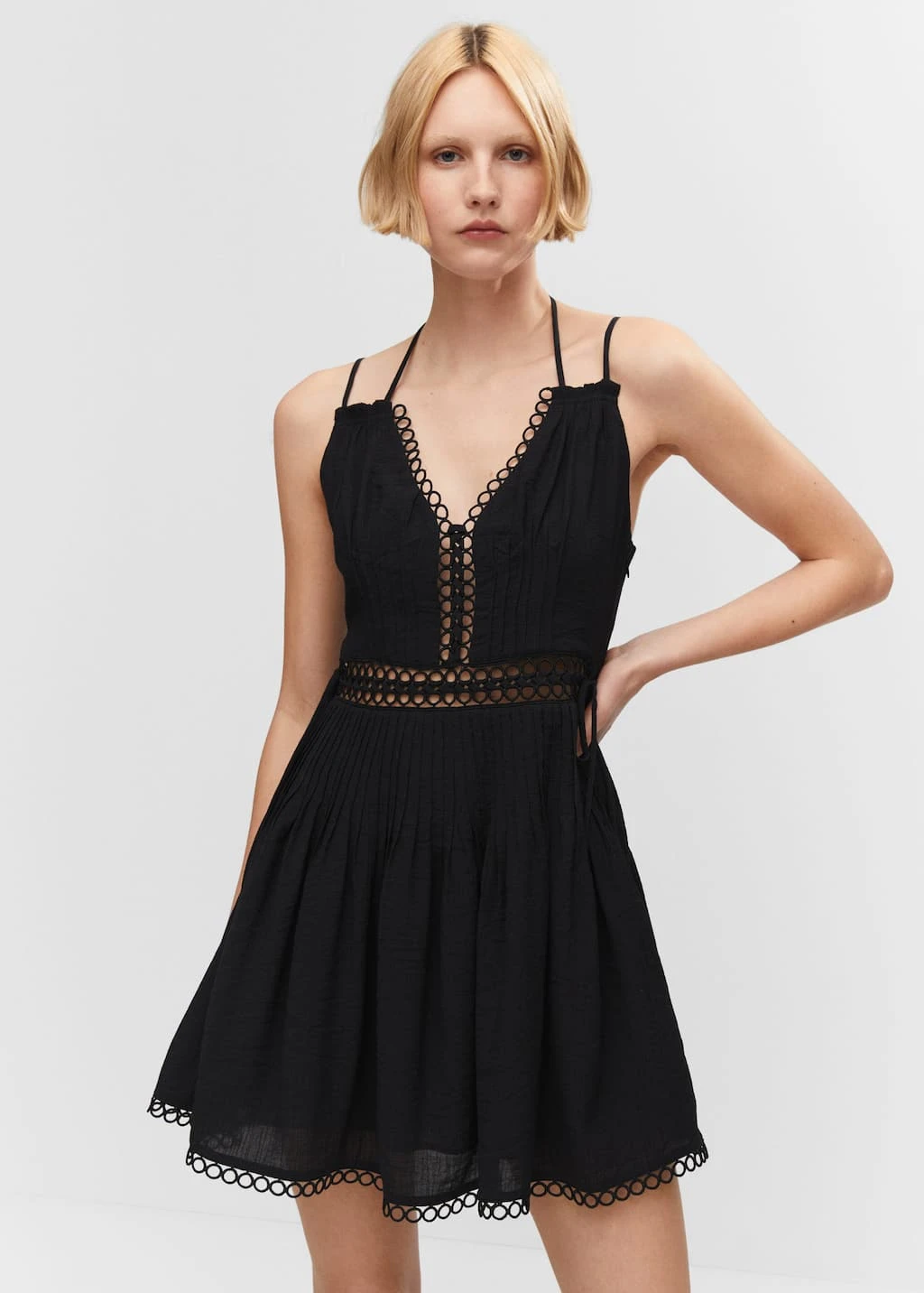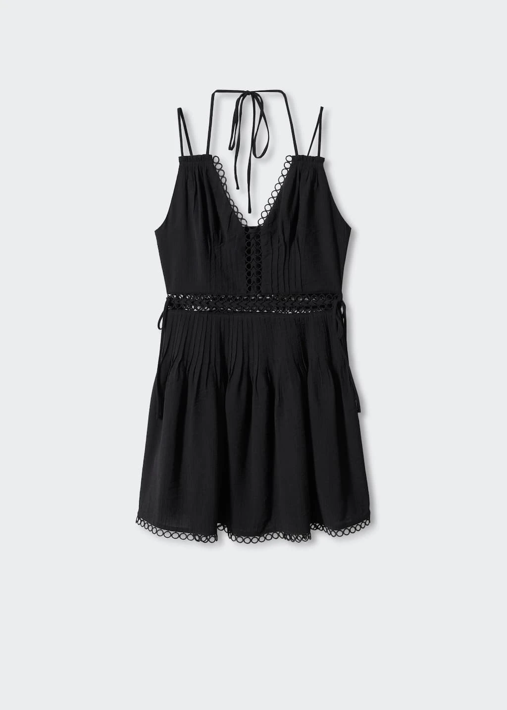 tissu plisse, tissu fluide, evase, coupe courte, col en v, bretelles fines doubles, bretelles ajustables, lien a nouer au dos, empiecements en dentelle, empiecements ajoures, saison des festivalsComposition: 82% viscose,18% polyamide. Doublure: 100% coton. Dentelle: 100% polyester