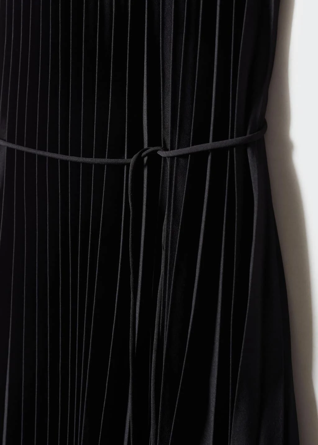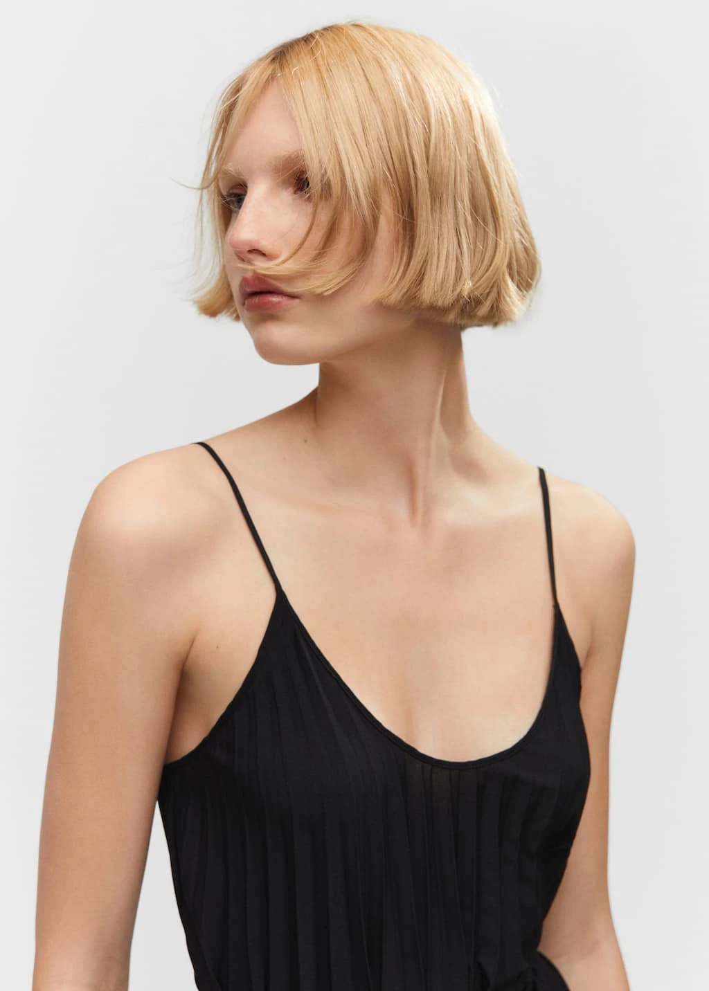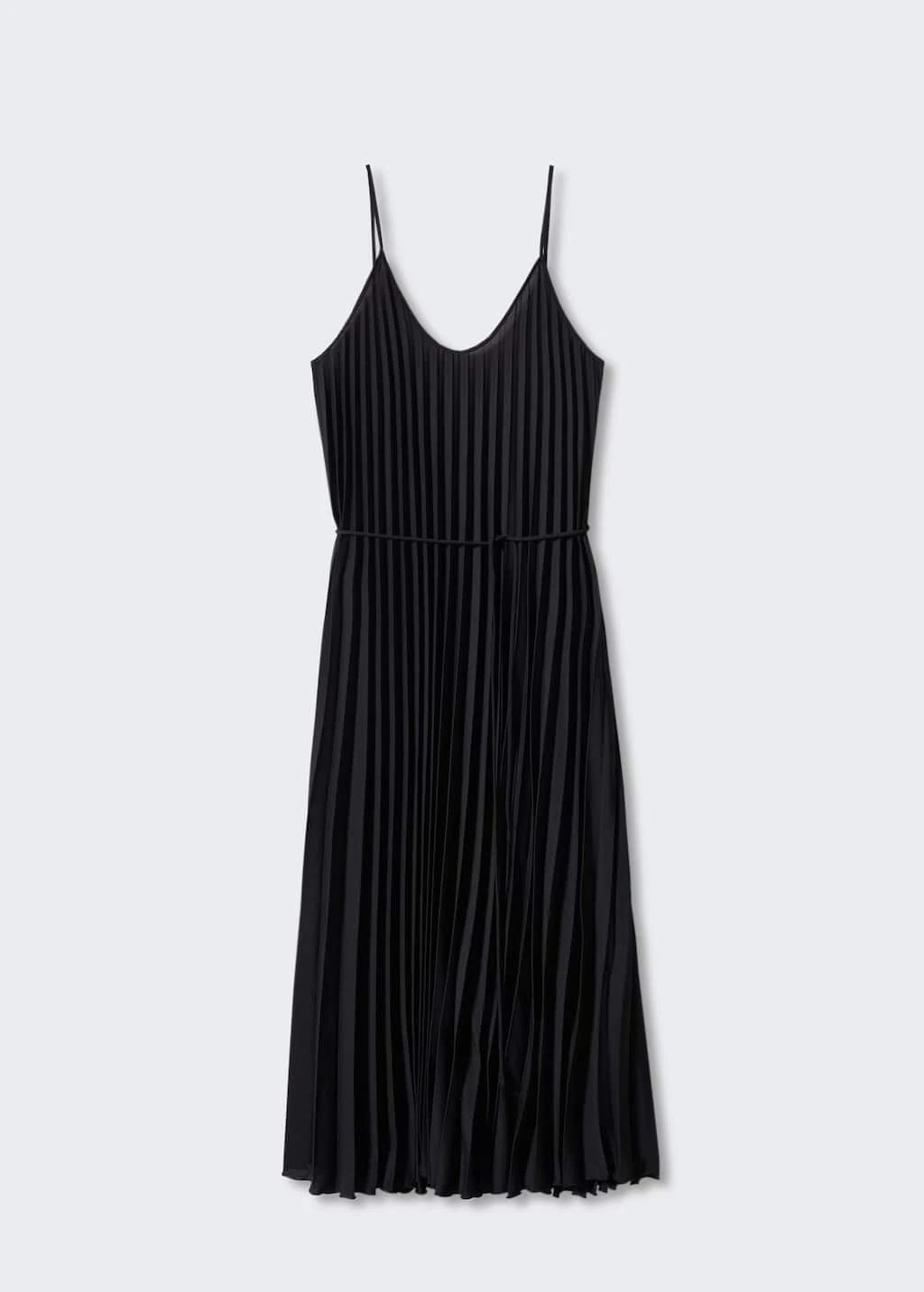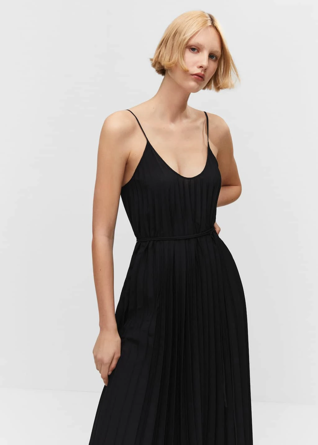 tissu fluide, design plisse, coupe midi, evase, col echancre, bretelles fines, cordon de serrage, sans fermeture, collection fetes et ceremoniesComposition: 100% polyester