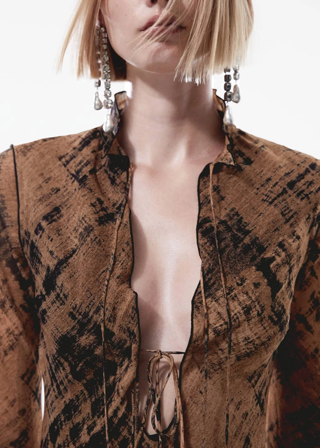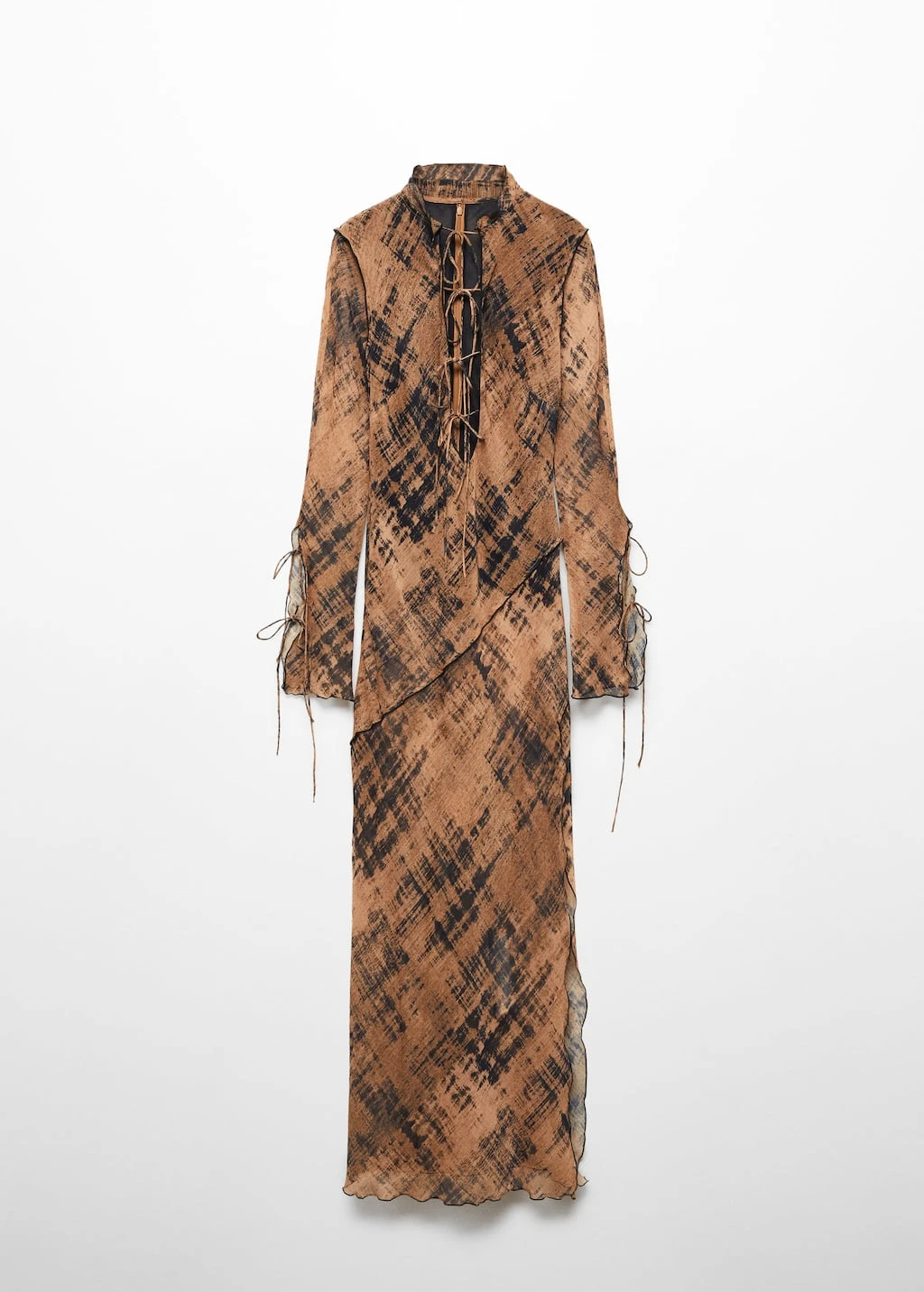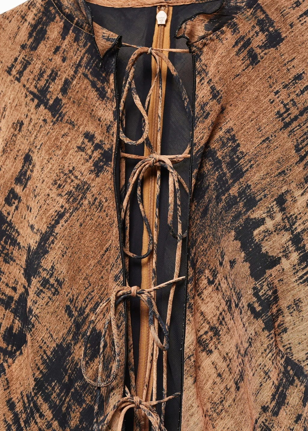tissu fluide, tissu en gaze, ajuste, coupe longue, imprime abstrait, col echancre, fente laterale, fermeture a nœuds sur le devant, fermeture eclair a l’arriere, collection fetes et ceremoniesComposition: 100% polyester