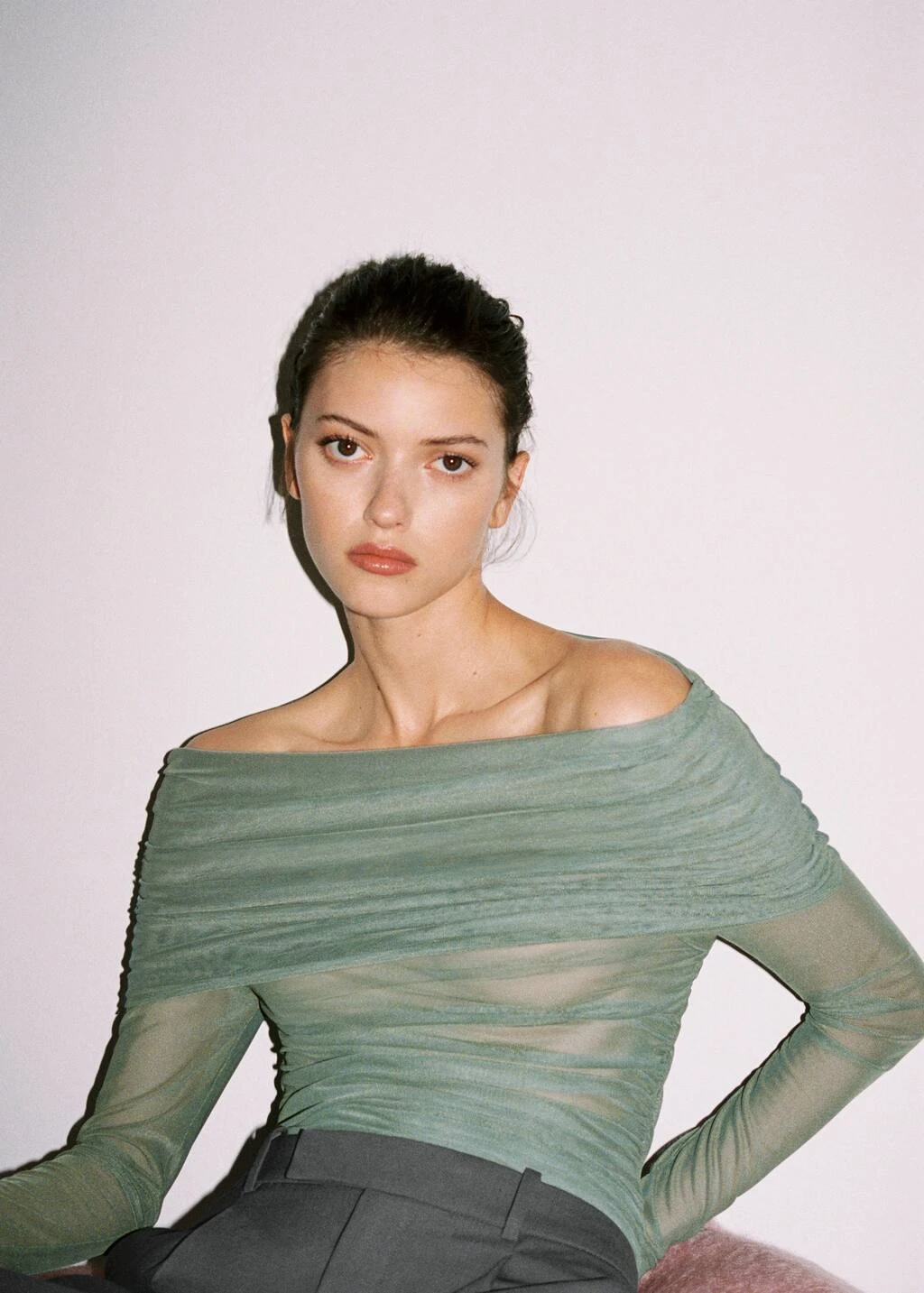 tissu en maille filet, tissu fronce, ajuste, epaules denudees, manches longues, sans fermetureComposition: 94% polyester,6% elasthanne