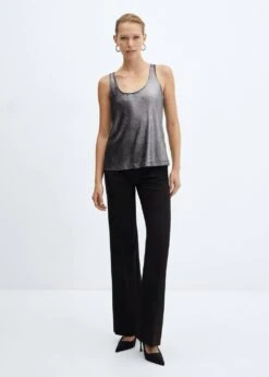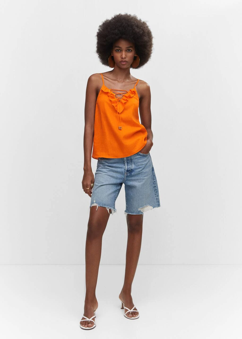 tissu en lin melange, tissu fluide, droit, col en v avec fermeture a cordon, bretelles fines ajustables, details volantes, dos fronce, perles en boisComposition: 55% lin,45% viscose